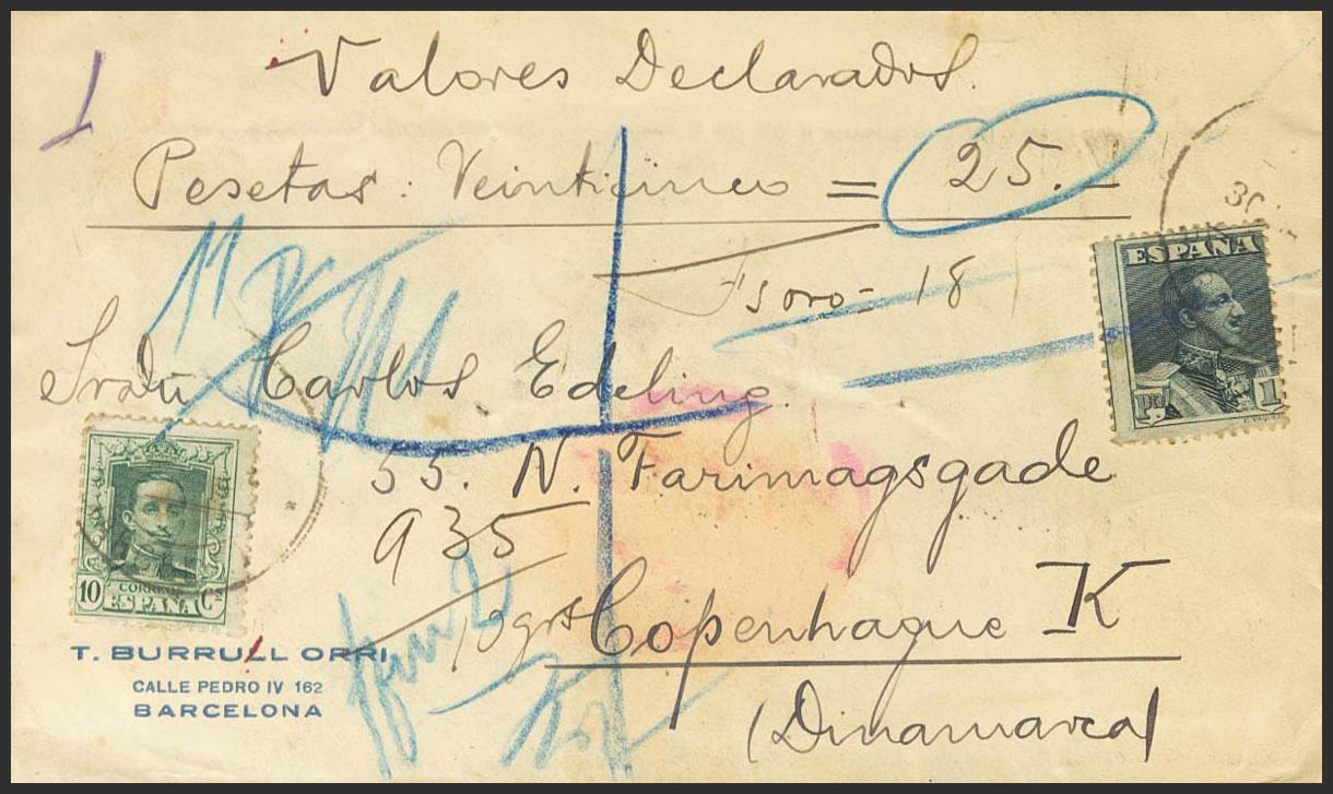 314, 321. 1925. 10 cts green and 1 pts slate. Declared Values ​​from BARCELONA to COPENHAGEN (DENMARK). On the back transits Perpignan, Karlsruhe and arrival. MAGNIFICENT AND RARE.