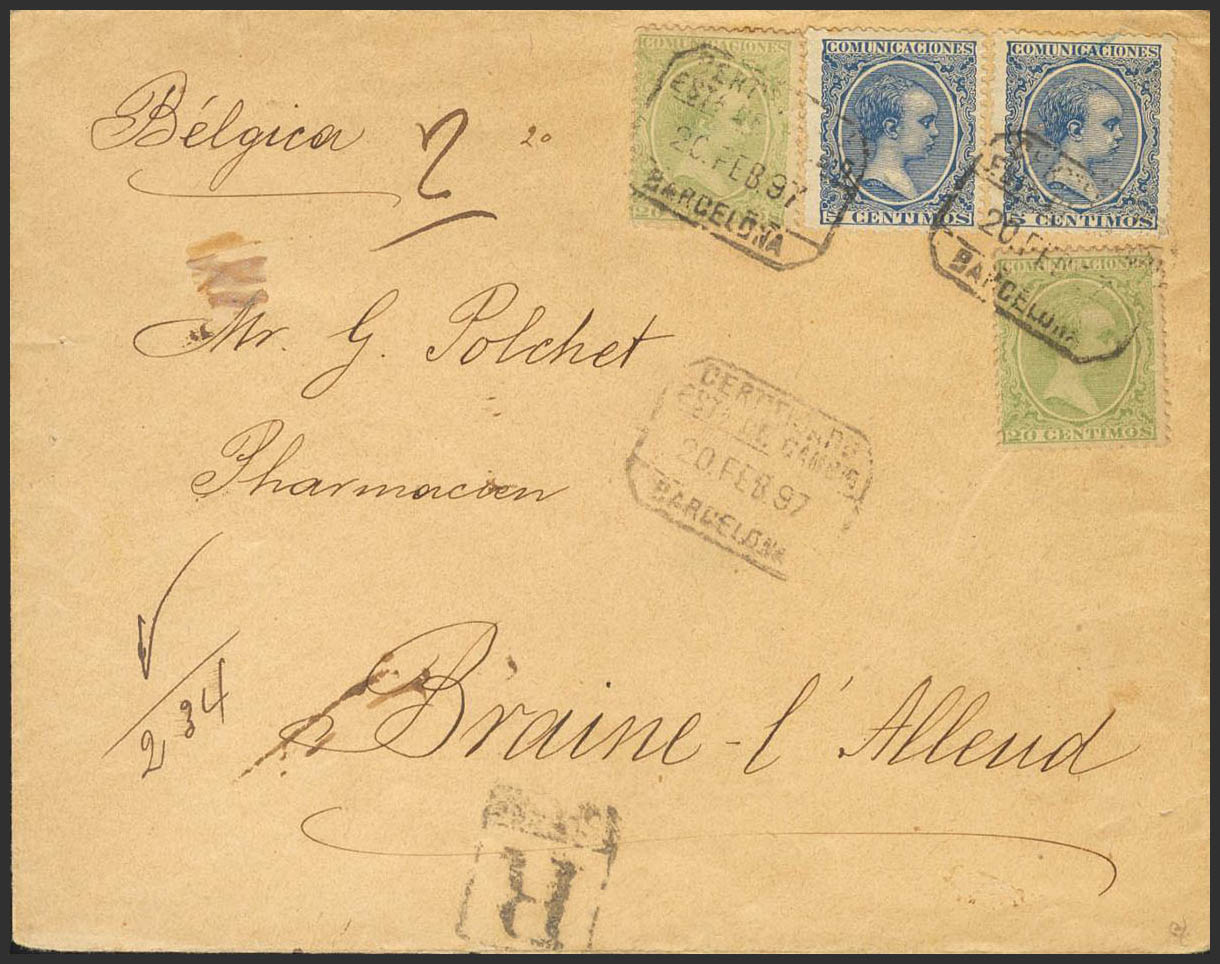 English 215(2), 220(2). 1897. 5 cts blue, two stamps and 20 cts green yellow, two stamps. Certificate from BARCELONA to BRAINE L´ALLEND (BELGIUM). On the back arrival. MAGNIFICENT AND UNUSUAL POSTAGE.