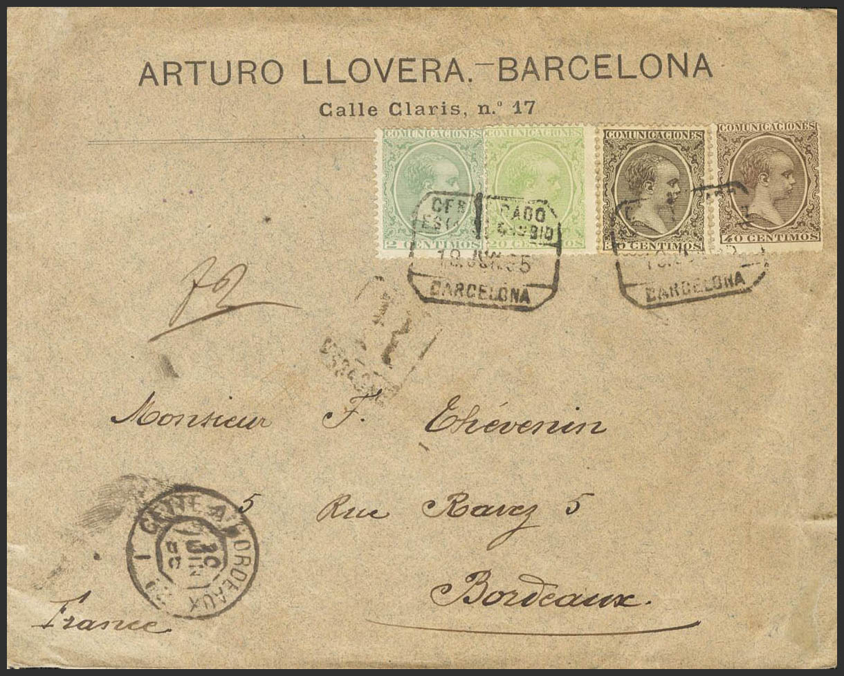 213, 220, 222, 223. 1895. 2 cts green, 20 cts yellow green, 30 cts bronze green and 40 cts chestnut. Certificate from BARCELONA to BORDEAUX (FRANCE). MAGNIFICENT AND RARE POSTAGE.