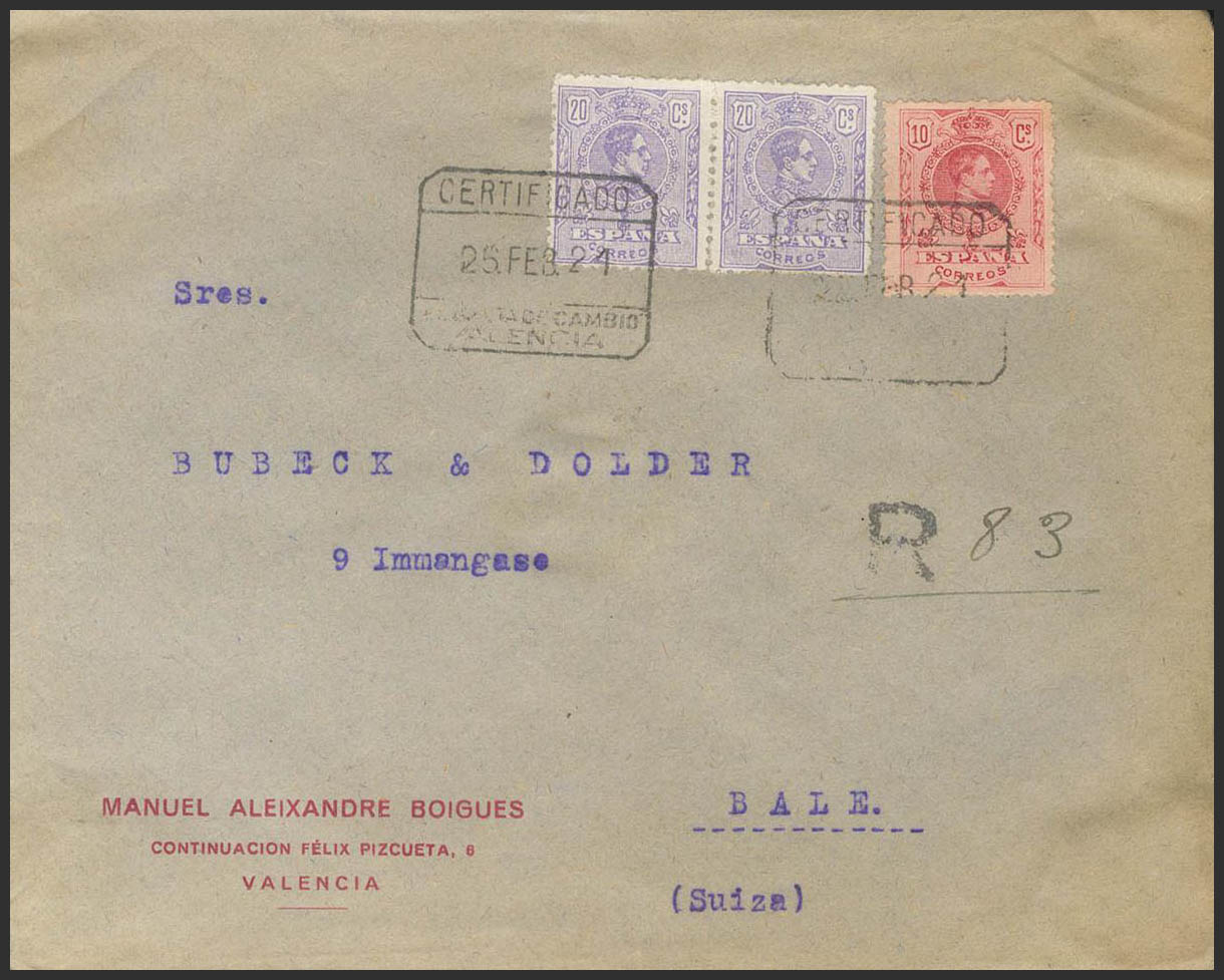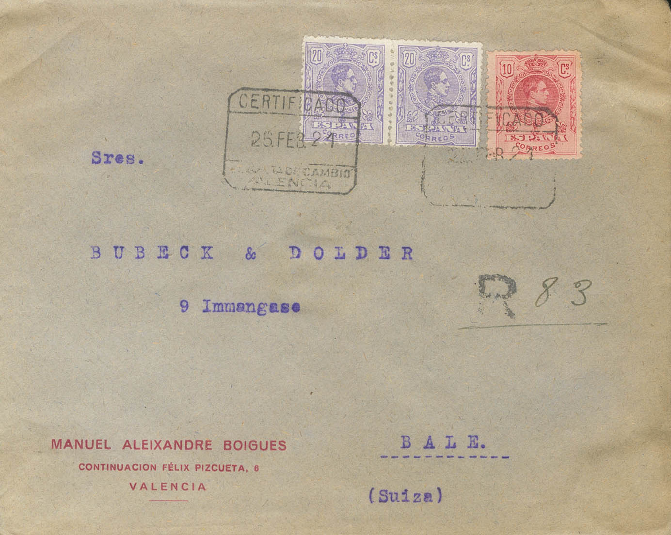 290(2), 269. 1921. 20 cts violet, pair and 10 cts red. Certificate from VALENCIA to BASEL (SWITZERLAND). On the back arrival. MAGNIFICENT.