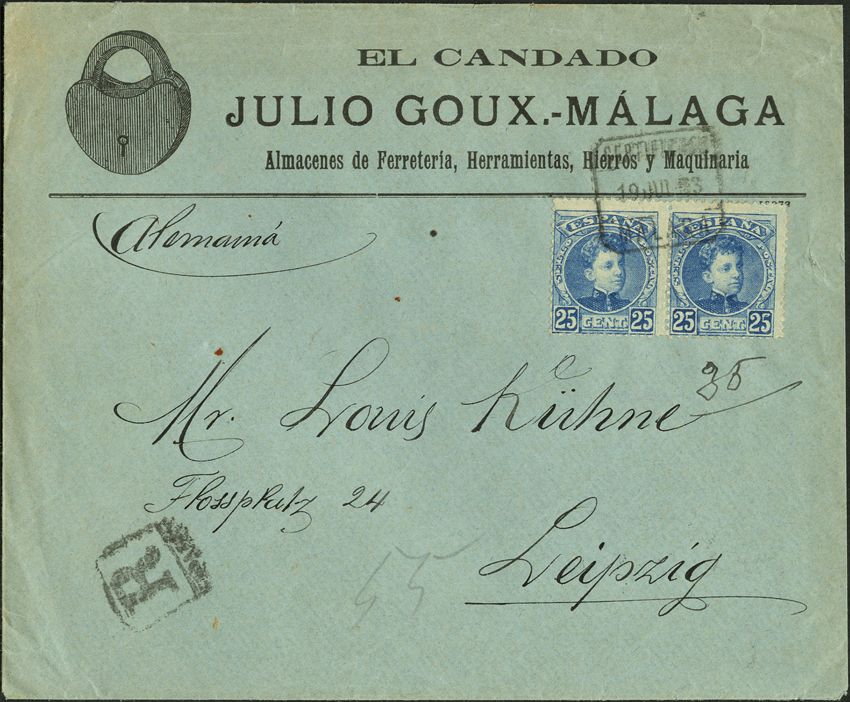 248(2). 1903. 25 cts blue, pair. MALAGA to LEIPZIG. CERTIFIED postmark / MALAGA. MAGNIFICENT.
