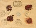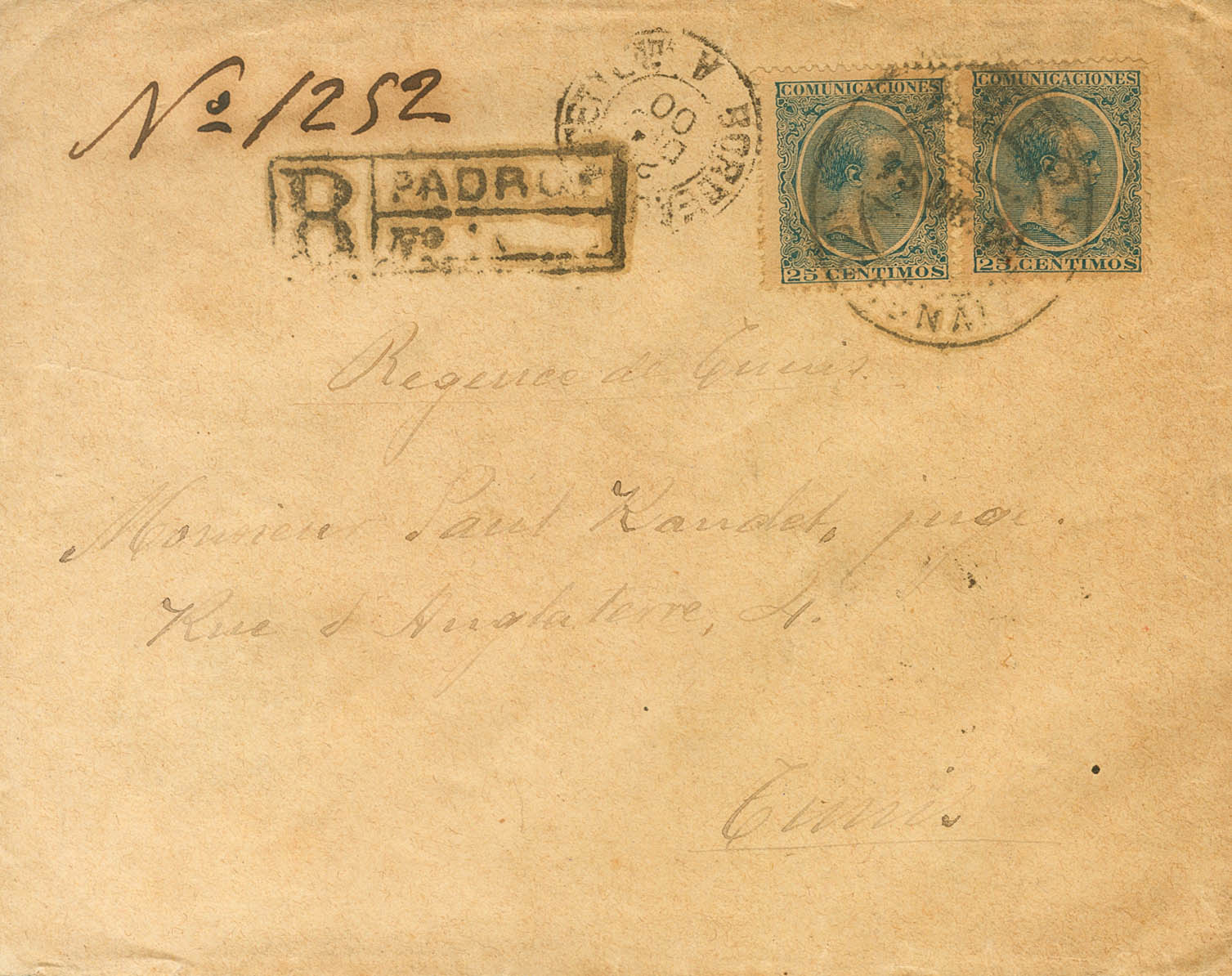 |ENVELOPE| 221(2). 1889. 25 cts blue, two stamps. Certificate from PADRON (LA CORUÑA) to TUNISIA. Postmark PADRON / (CORUÑA), on the back transits through Barcelona, Marseille and arrival. MAGNIFICENT AND RARE DESTINATION.