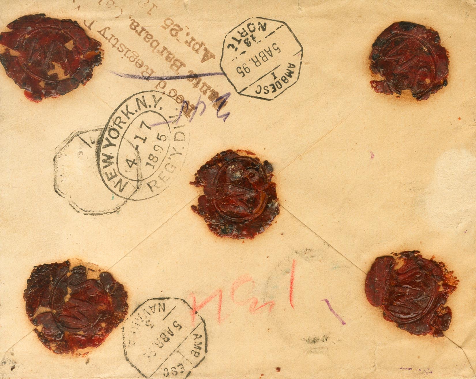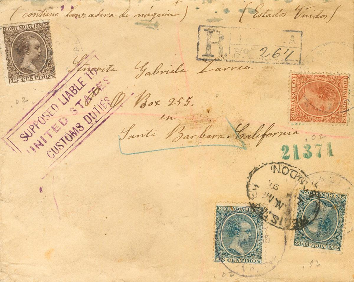 |ENVELOPE| 217, 219, 221(2). 1895. 10 cts yellow chestnut, 15 cts lilac chestnut and 25 cts blue, two stamps. Certificate from TAFALLA (NAVARRA) to SANTA BARBARA (USA), circulated via England. On the front handwritten note "Contains machine shuttle" and mark SUPPOSED LIABLE TO UNITED STATES / CUSTOM DUTIES, in violet, on the back traveling salesmen and transit through New York and arrival. MAGNIFICENT AND RARE.