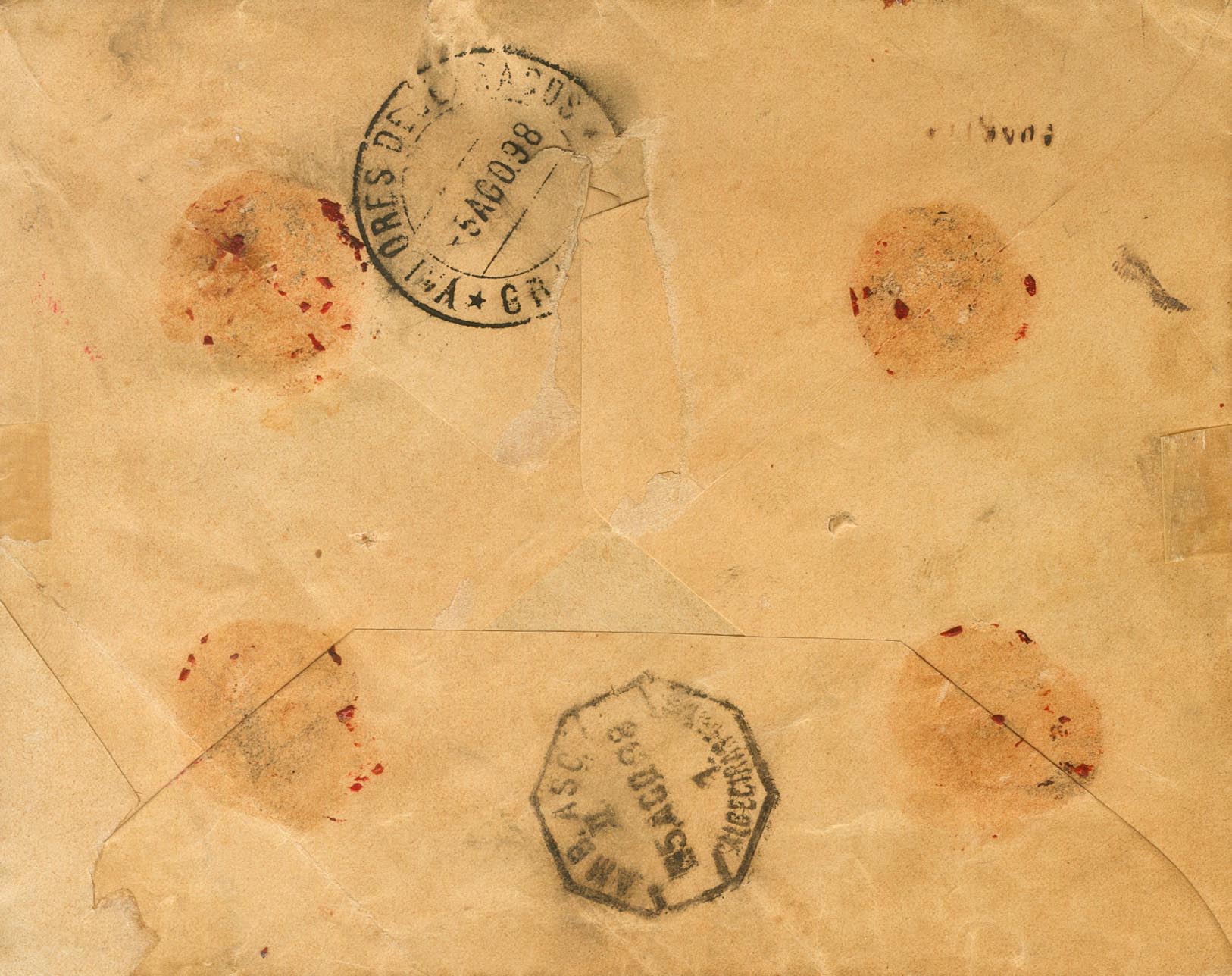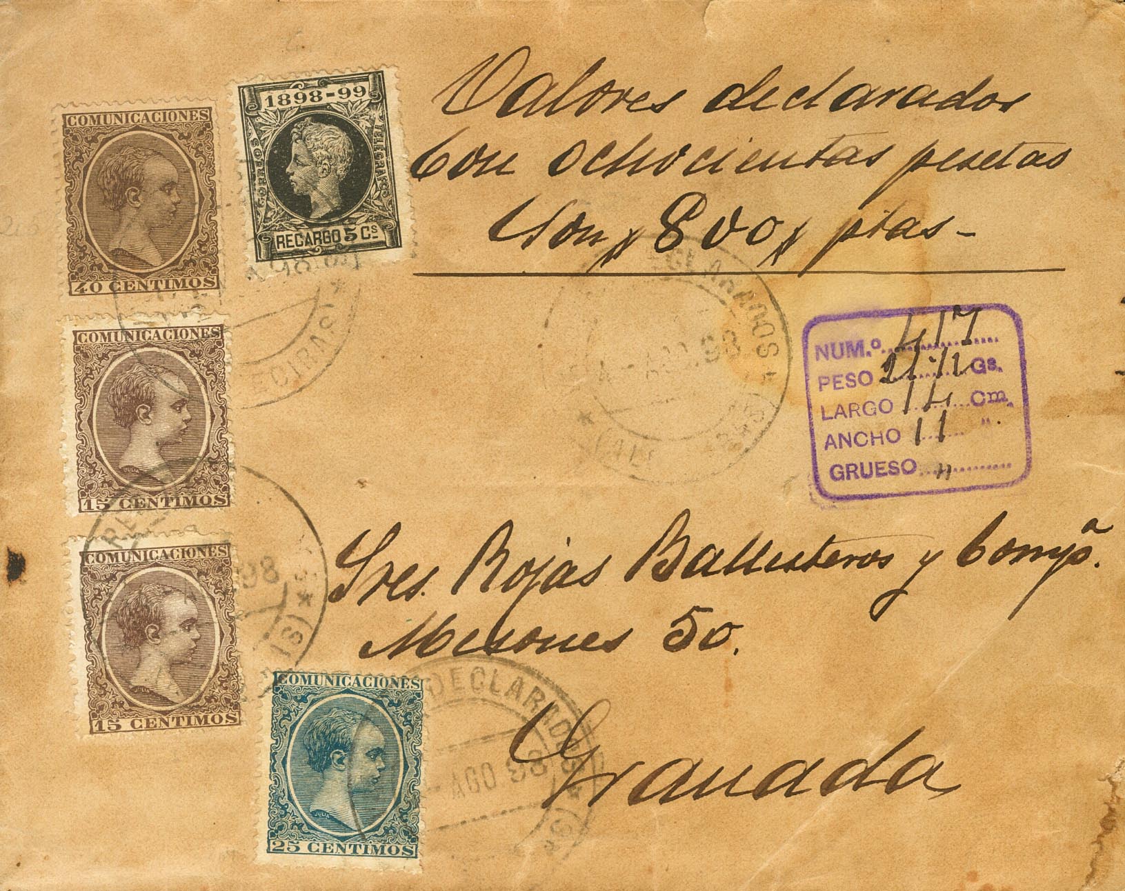 |ENVELOPE| 219(2), 221, 223, 240. 1898. 15 cts lilac brown, two stamps, 25 cts blue, 40 cts brown and 5 cts black of War Tax. Declared Values from ALGECIRAS (CADIZ) to GRANADA. Postmark DECLARED VALUES / (ALGECIRAS) and on the front mark of weights and dimensions, in violet (the letter was not appraised despite having insufficient postage worth 25 cts, the correct postage should be 1.20 pts (15 cts postage, 25 cts certified and 80 cts declared values)). MAGNIFICENT AND VERY RARE.
