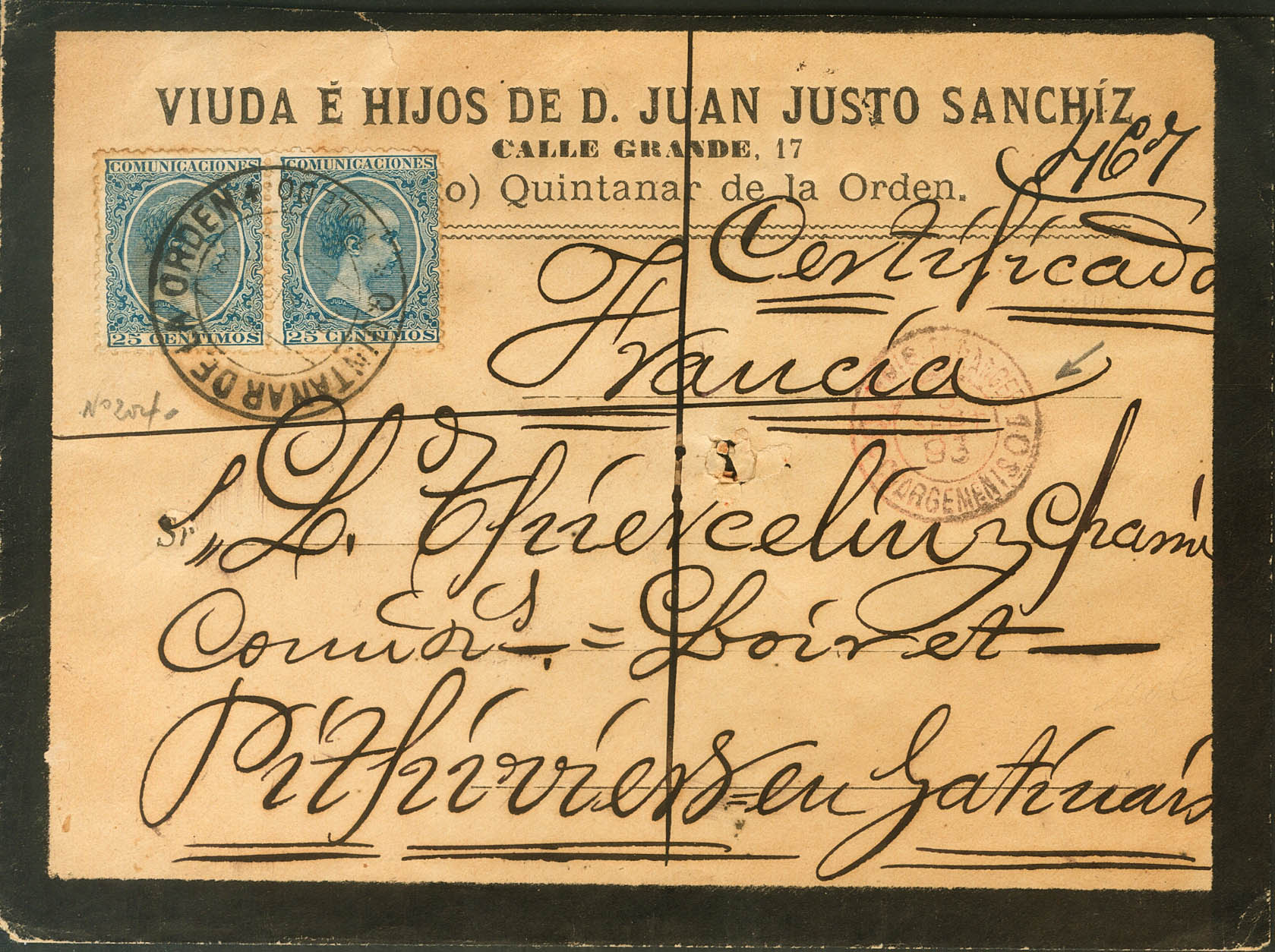 |ABOUT| 221(2). 1893. 25 cts blue, pair. Certificate from QUINTANAR DE LA ORDEN (TOLEDO) to PITHIVIERS (FRANCE). Arrival on the back. MAGNIFICENT.