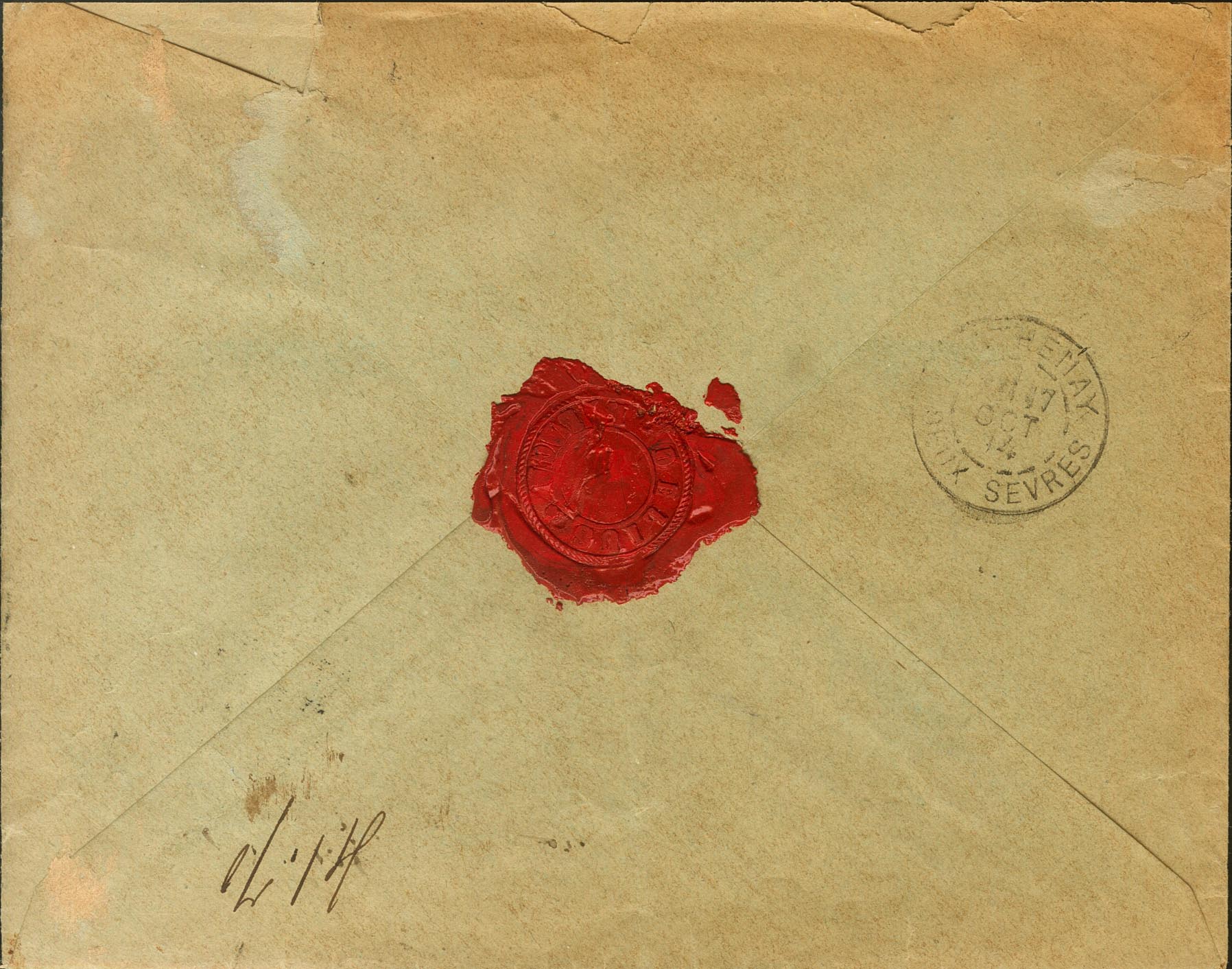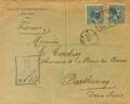 |ENVELOPE| 221(2). 1894. 25 cts blue, two stamps. Certificate from MALAGA to PARTHENAY (FRANCE). On the front unusual certificate mark, in violet and on the back arrival. MAGNIFICENT.