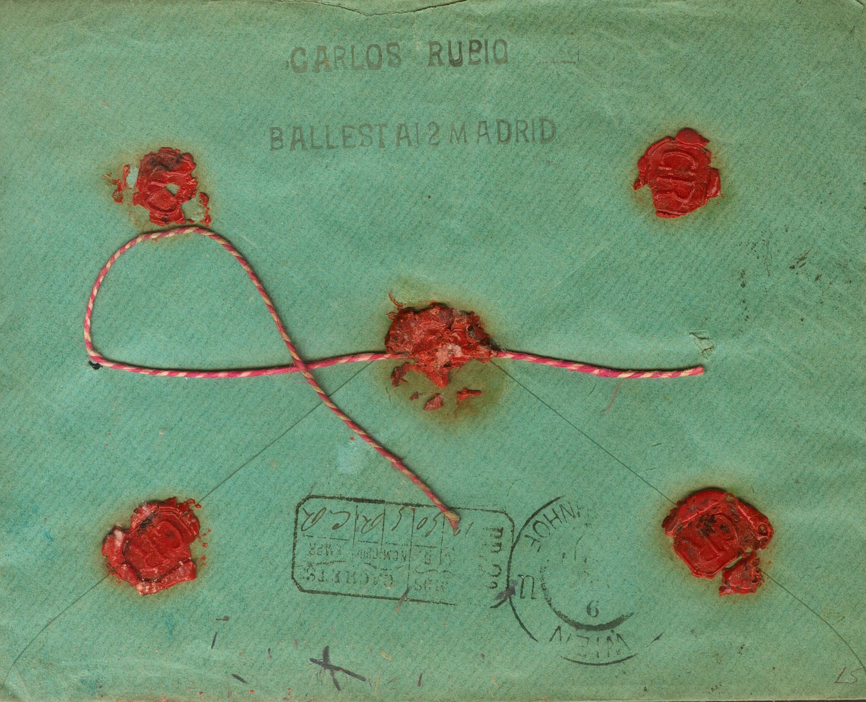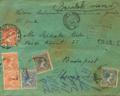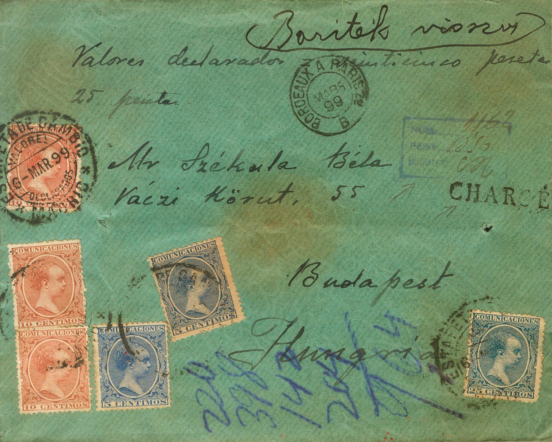 |ENVELOPE| 215(2), 217(3), 221. 1899. 5 cts blue, two stamps, 10 cts yellow chestnut, three stamps and 25 cts blue. Declared values from MADRID to BUDAPEST (HUNGARY). On the front, certificate and French transit marks, on the back, weight and size marks, WIEN / HAUPTBANHOF transit and sealing wax. MAGNIFICENT AND RARE, INSUFFICIENT POSTAGE FOR ONE POSTAGE AND NOT APPRAISED.