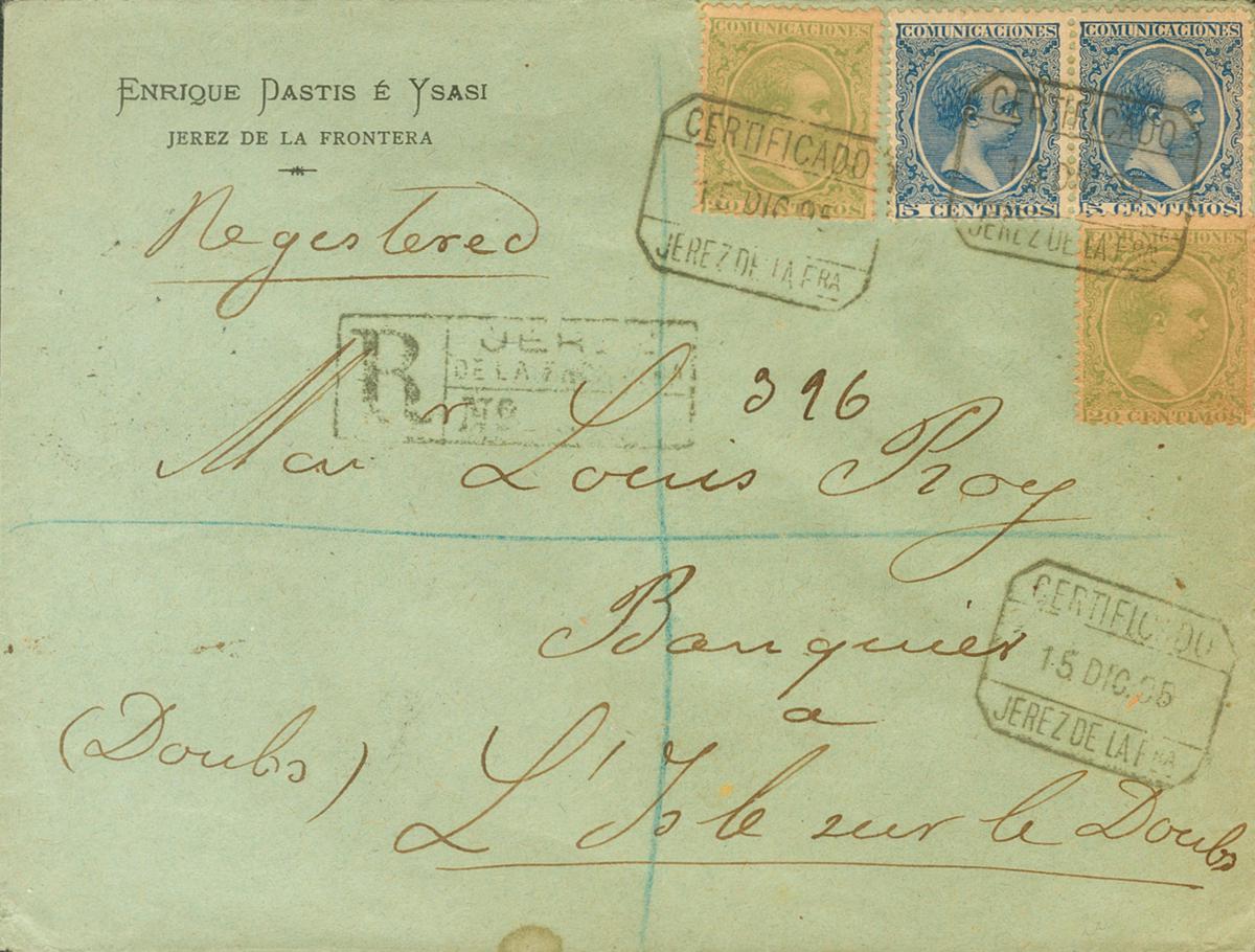 |ENVELOPE| 215(2), 220(2). 1895. 5 cts blue, two stamps and 20 cts green-yellow, two stamps. Certificate from JEREZ DE LA FRONTERA to LE ISLE SUR LE DOVAS (FRANCE). Arrival on the back. MAGNIFICENT AND UNUSUAL COMBINATION OF POSTAGE TO COMPLETE THE RATE OF CERTIFIED SIMPLE POSTAGE, PIECE OF ENORMOUS BEAUTY.