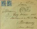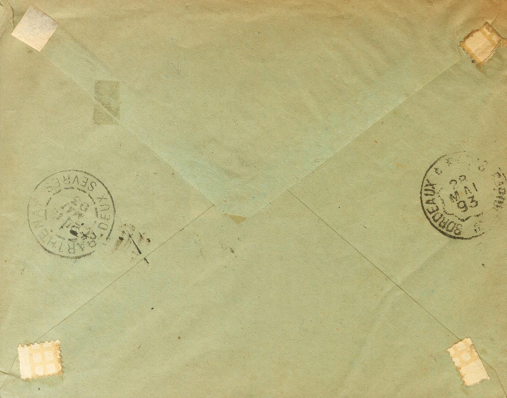 |ABOUT| 221(2). 1893. 25 cts blue, two stamps. Certificate from BAGoodELONA to PARTHENAY (FRANCE). On the front it marks R / ESPAGNE and French street sign CETTE A BORDEAUX RAPIDE. MAGNIFICENT.