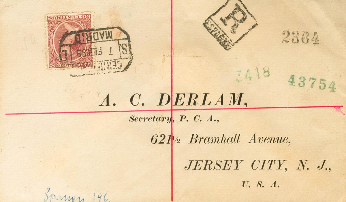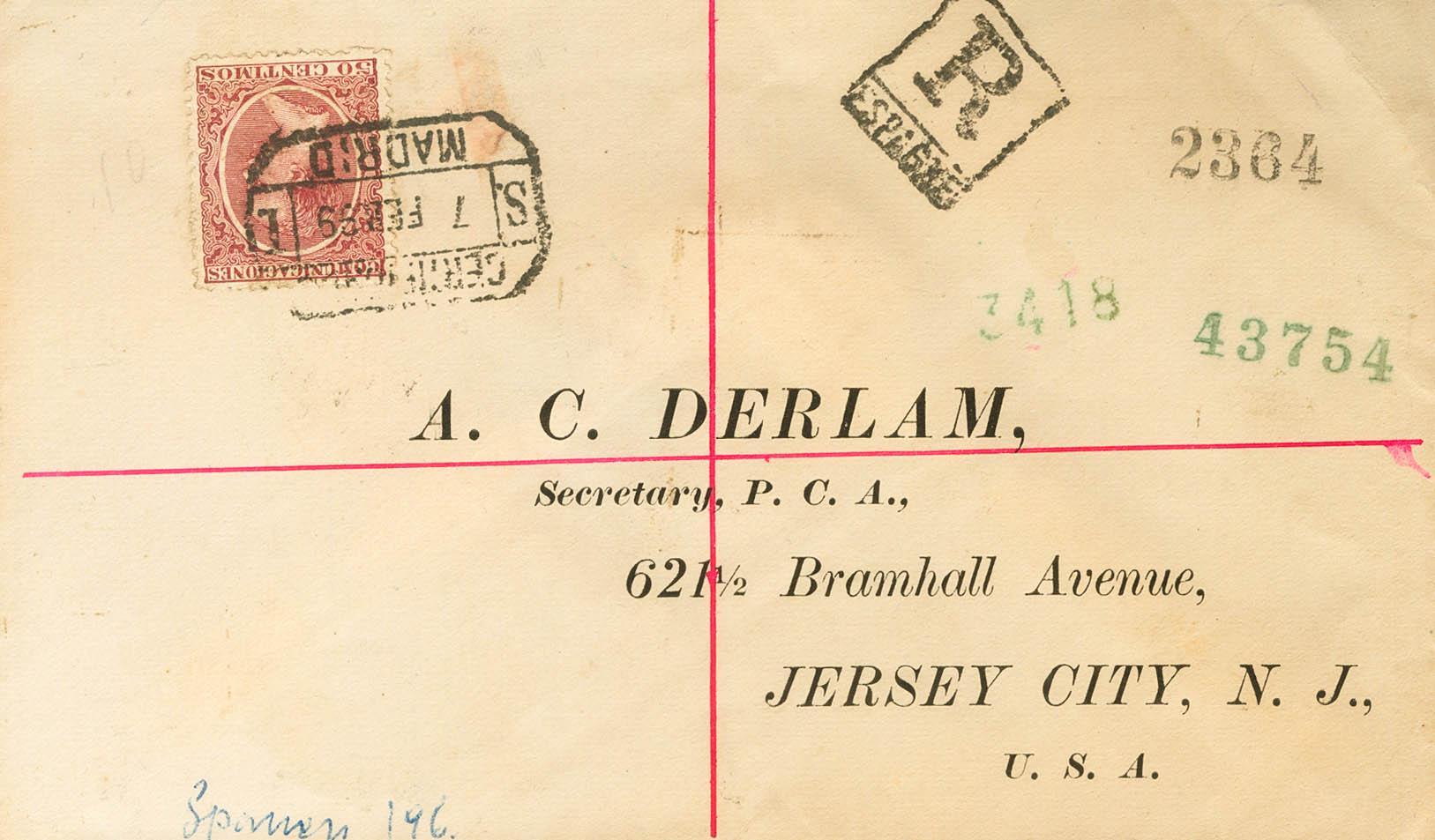 English |ENVELOPE| 224. 1899. 50 cts carmine rose. Certificate from MADRID to JERSEY (USA). Arrival on the back. MAGNIFICENT.