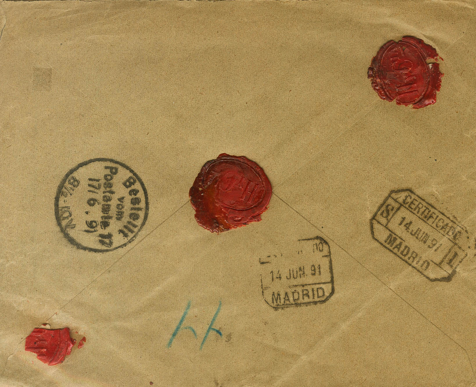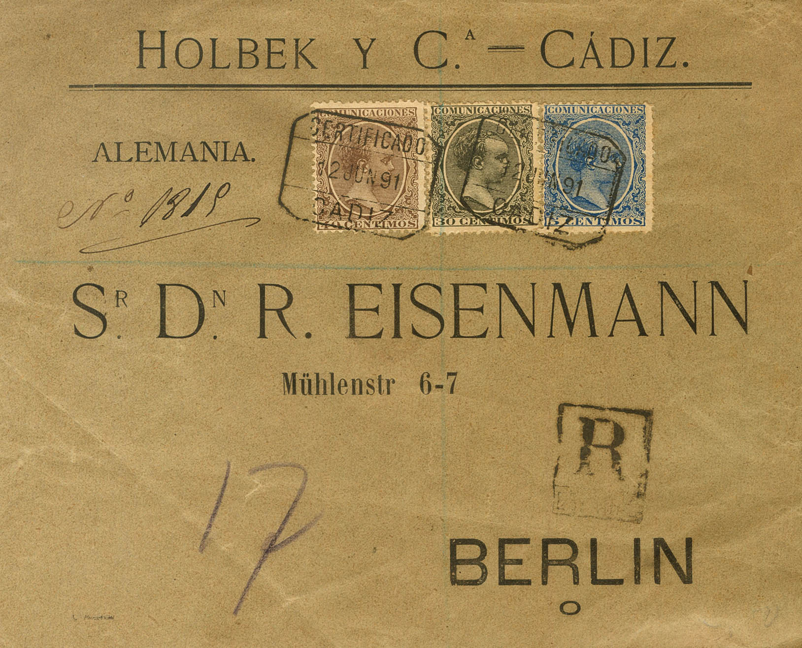 |ENVELOPE| 215, 222, 223. 1891. 5 cts blue, 30 cts bronze green, 40 cts chestnut. Certificate from CADIZ to BERLIN (GERMANY). Double postage. MAGNIFICENT AND SPECTACULAR.