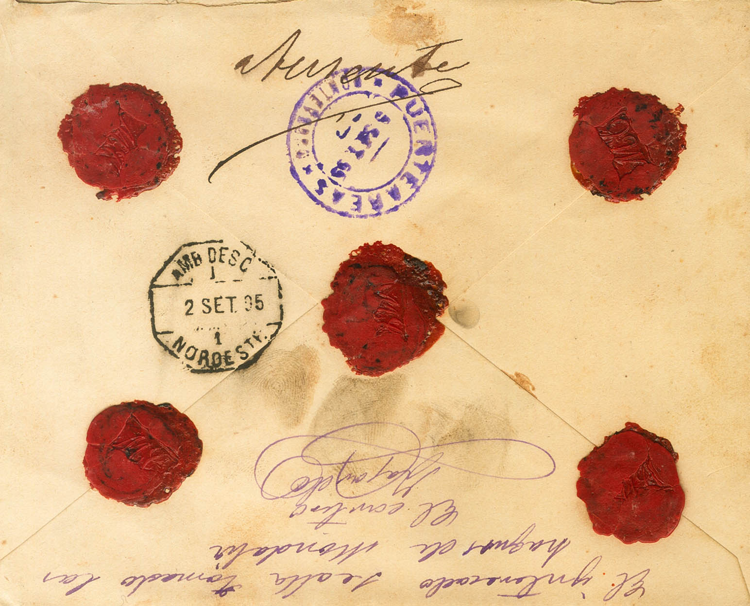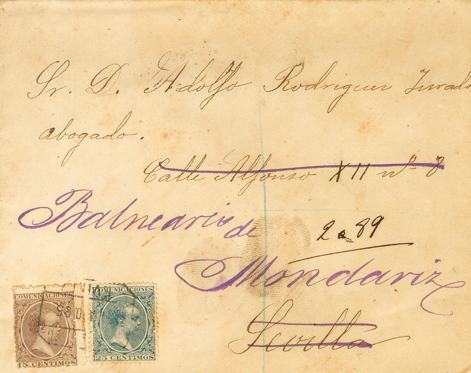 |ABOUT| 219, 221. 1895. 15 cts brown lilac and 25 cts blue. Interior Mail of SEVILLA, and forwarded to the BALNEARIO DE MONDARIZ (PONTEVEDRA). On the back handwritten annotation "The interested party goes there taking the haguas of Mondariz" and PUENTEAREAS / PONTEVEDRA date stamp, in violet. MAGNIFICENT AND UNUSUAL RE-EXPEDITION.