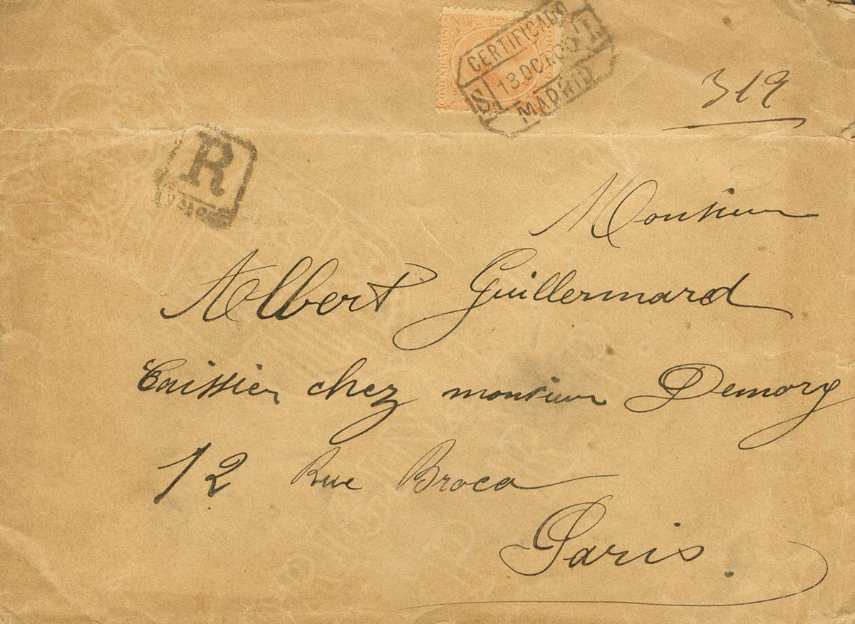 English |ENVELOPE| 225. 1900. 75 cts orange. Certified from MADRID to PARIS (FRANCE). Double postage, arrival on the back. MAGNIFICENT AND UNUSUAL.