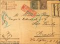 |ENVELOPE| 215, 226. 1900. 5 cts blue and 1 pts violet. Front of Certificate from BAGoodELONA to SAO PAULO (BRAZIL). On the front handwritten "Via inglesa and USA" and New York certificate label. MAGNIFICENT.