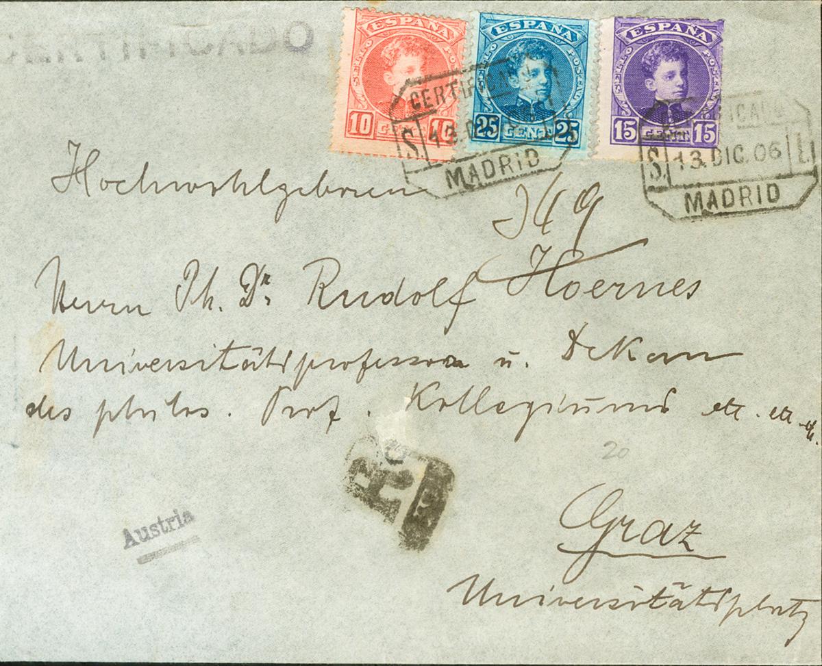 |ENVELOPE| 243, 246, 248. 1906. 10 cts red, 15 cts violet and 25 cts blue. Certificate from MADRID to GRAZ (AUSTRIA). On the back, letterhead of the embassy of Austria-Hungary and arrival. MAGNIFICENT.