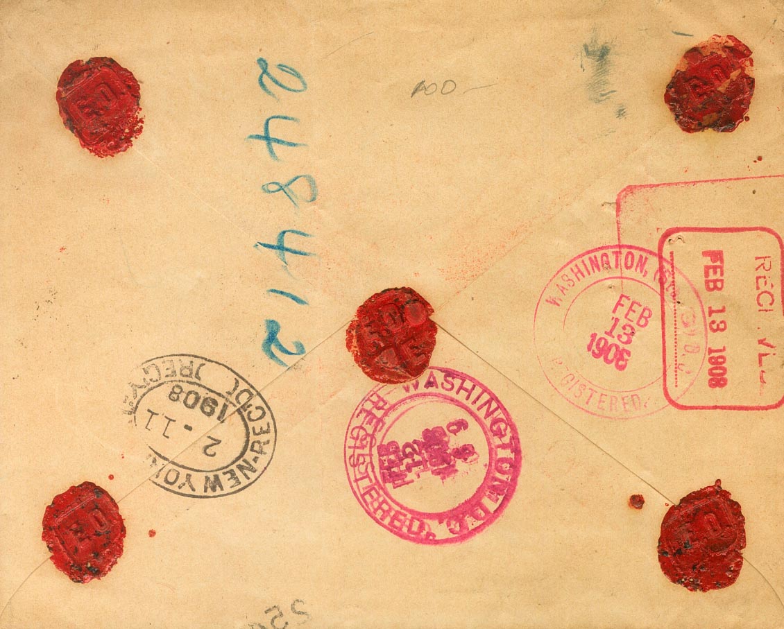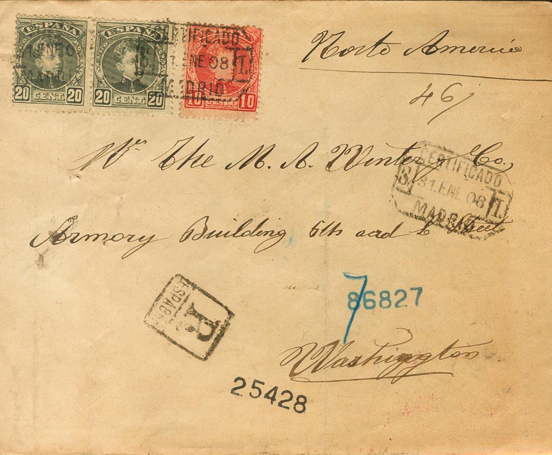 |ENVELOPE| 243, 247(2). 1906. 10 cts red and 20 cts black, two stamps. Certificate from MADRID to WASHINGTON (USA). Arrival on the back. MAGNIFICENT AND RARE.