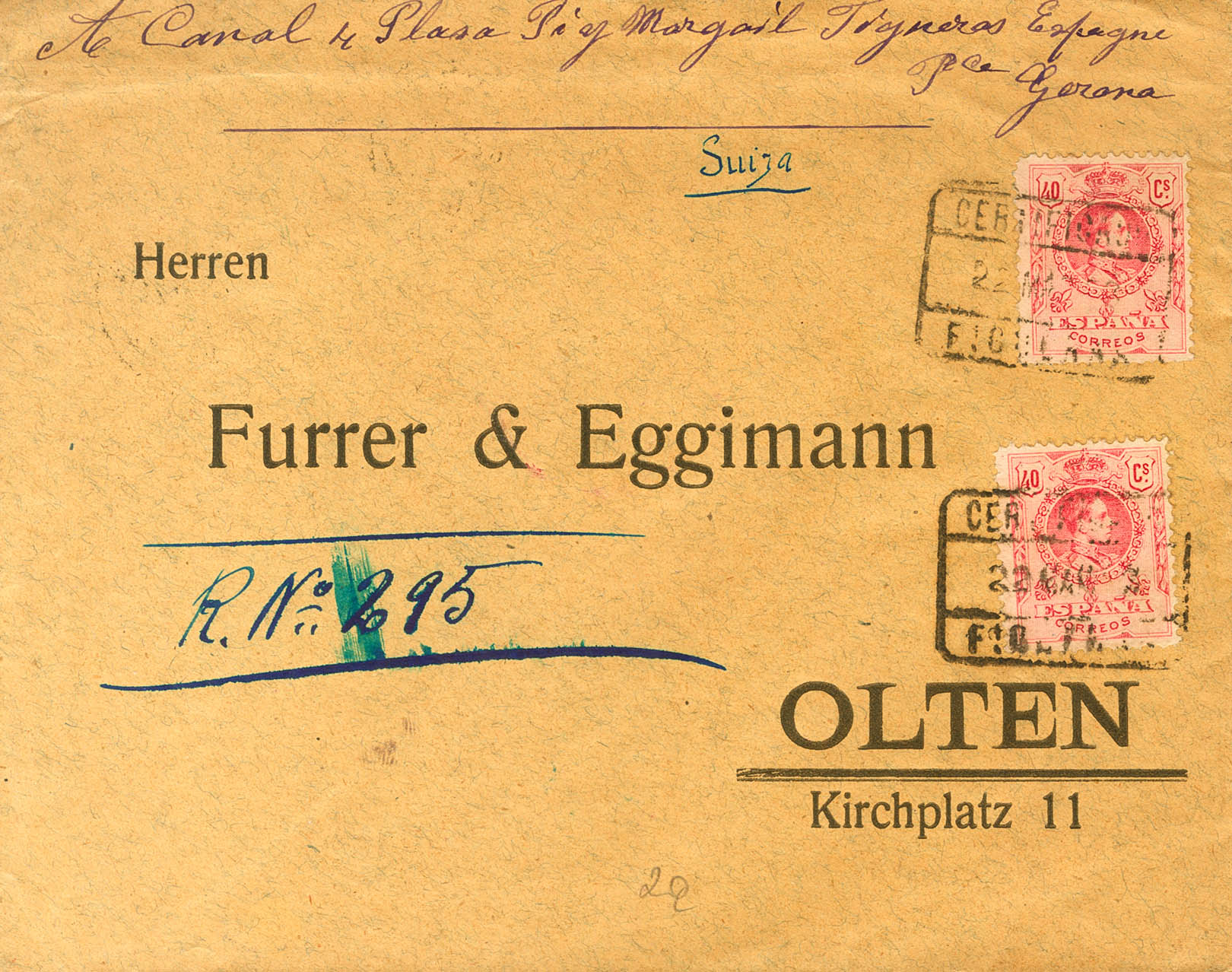 |ENVELOPE| 276(2). 1923. 40 cts pink, two stamps. Certificate from FIGUERAS to OLTEN (SWITZERLAND). Arrival on the back. MAGNIFICENT.