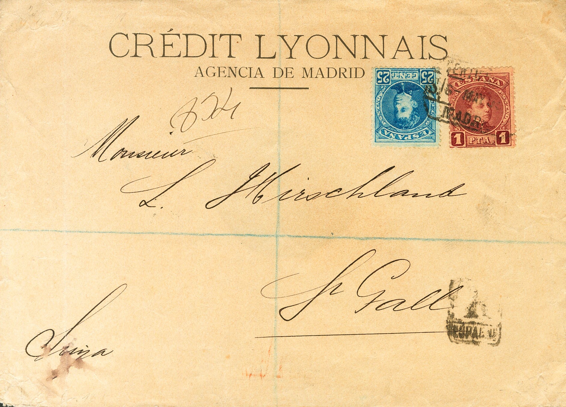 |ENVELOPE| 248, 253. 1905. 25 cts blue and 1 pts carmine. Certificate from MADRID to SAINT GALLEN (SWITZERLAND). Arrival on the back. MAGNIFICENT.