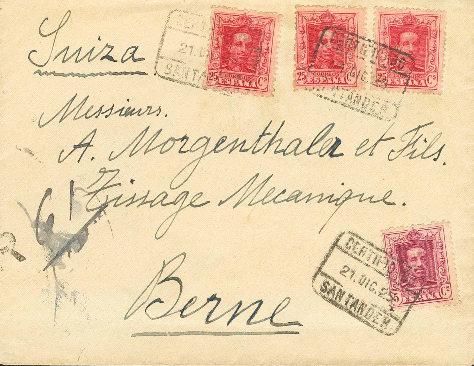 |ENVELOPE| 311, 317(3). 1925. 5 cts lilac, 25 cts carmine, three stamps. Certificate from SANTANDER to BERN (SWITZERLAND). Arrival on the back. MAGNIFICENT AND VERY NICE POSTAGE.