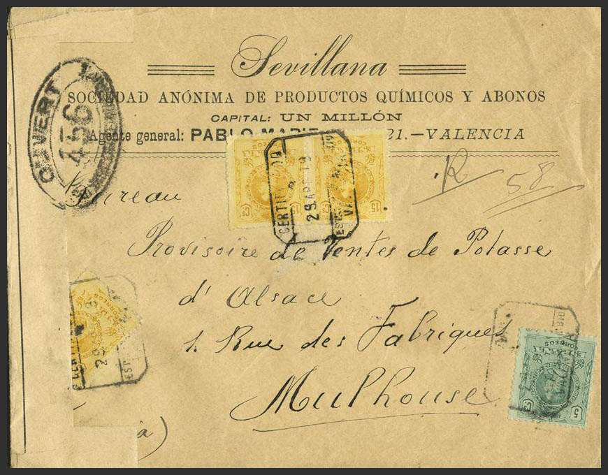 268, 271(3). 1919. 5 cts and 15 cts, three stamps. Certificate from VALENCIA to MULHOUSE (FRANCE). MAGNIFICENT.