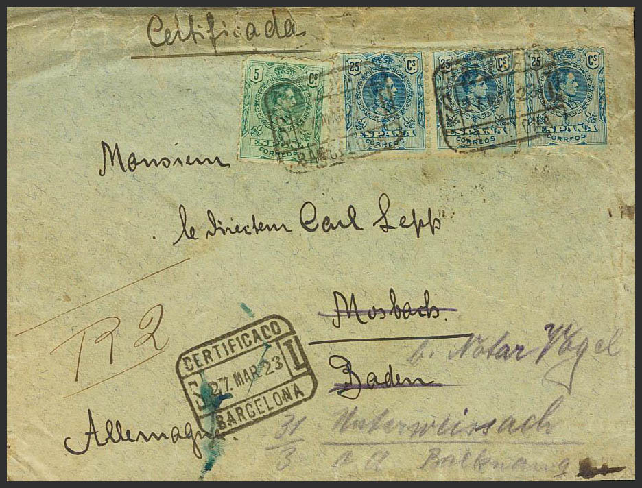 268, 274(3). 1923. 5 cts green and 25 cts blue, three stamps. Certificate from BARCELONA to MOSBACH and forwarded to UNTERWEISSACH (GERMANY). On the back arrival. MAGNIFICENT.