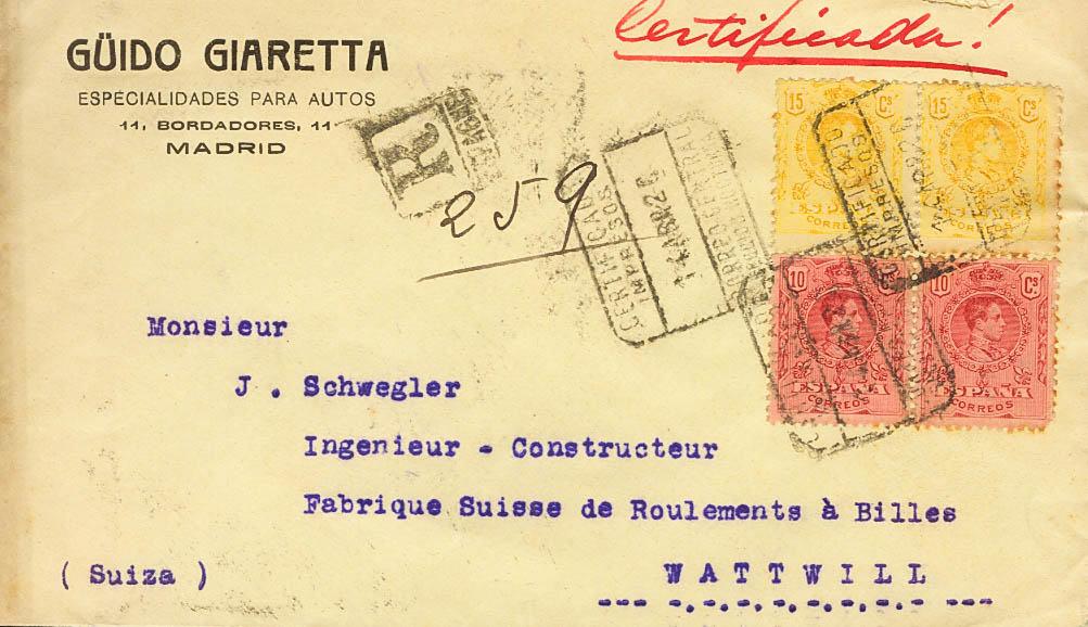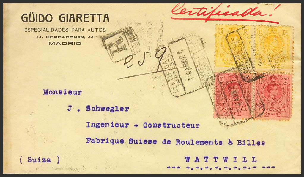 269(2), 271(2). 1920. 10 cts red, pair and 15 cts yellow, pair. Certificate from MADRID to WATTWILL (SWITZERLAND). On the back arrival. MAGNIFICENT.