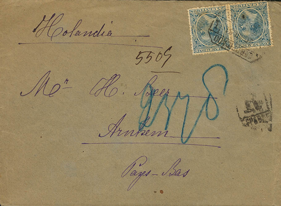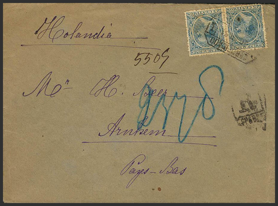221(2). 1891. 25 cts blue, pair. Certificate addressed to ARNHEM (NETHERLANDS). On the back arrival. MAGNIFICENT AND UNUSUAL DESTINATION.