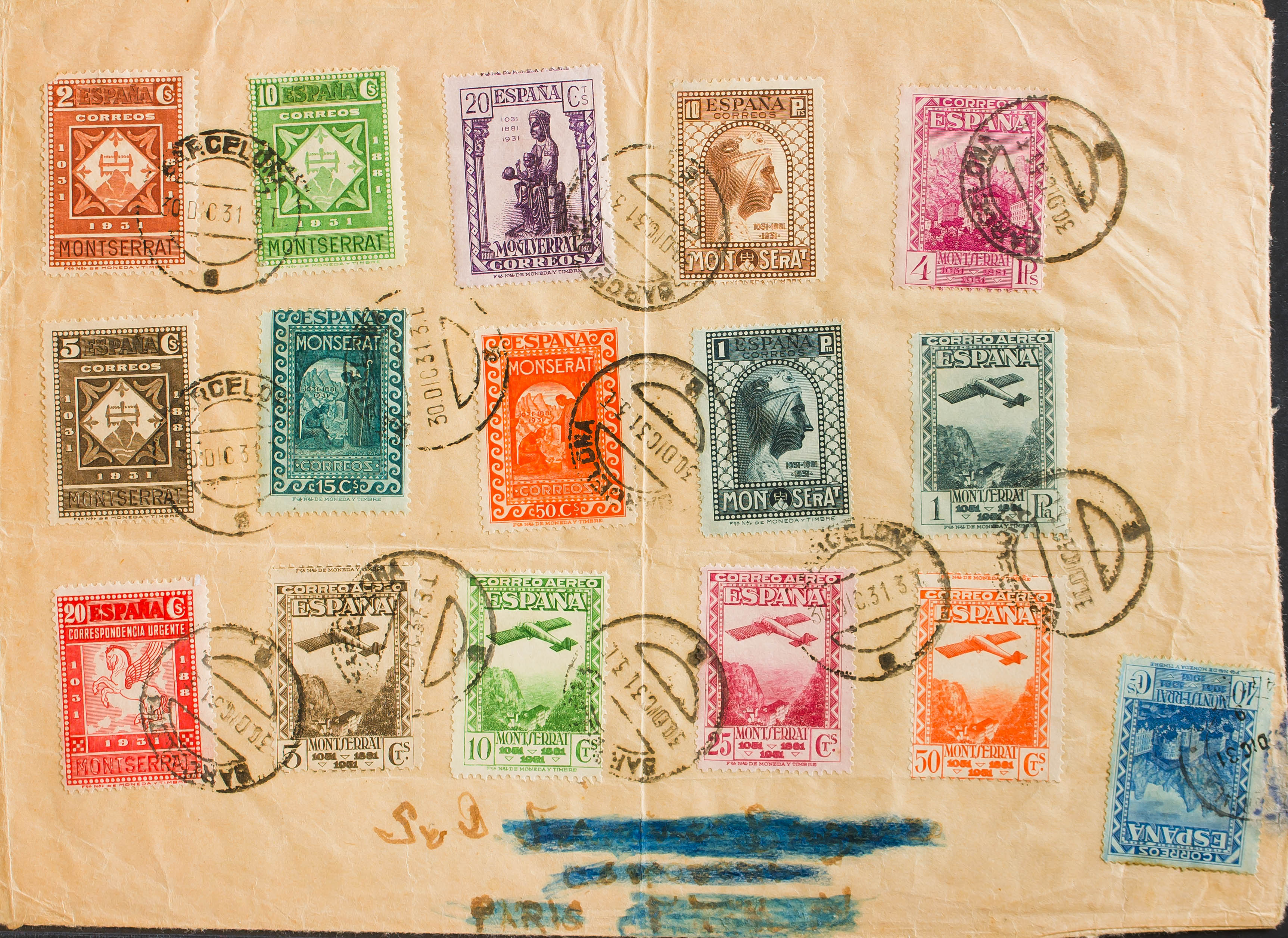 636/49, 650/54. 1931. Complete series, both Ordinary and Air Mail (the values of the ordinary 1 cts, 25 cts and 30 cts are franked on the back, and were not canceled in Barcelona), circulated in a Philatelic letter from BARCELONA to PARIS (the address is 'overwritten '), backstamps voided with PARIS dater, on arrival. MAGNIFICENT AND VERY RARE, VERY SPECTACULAR.