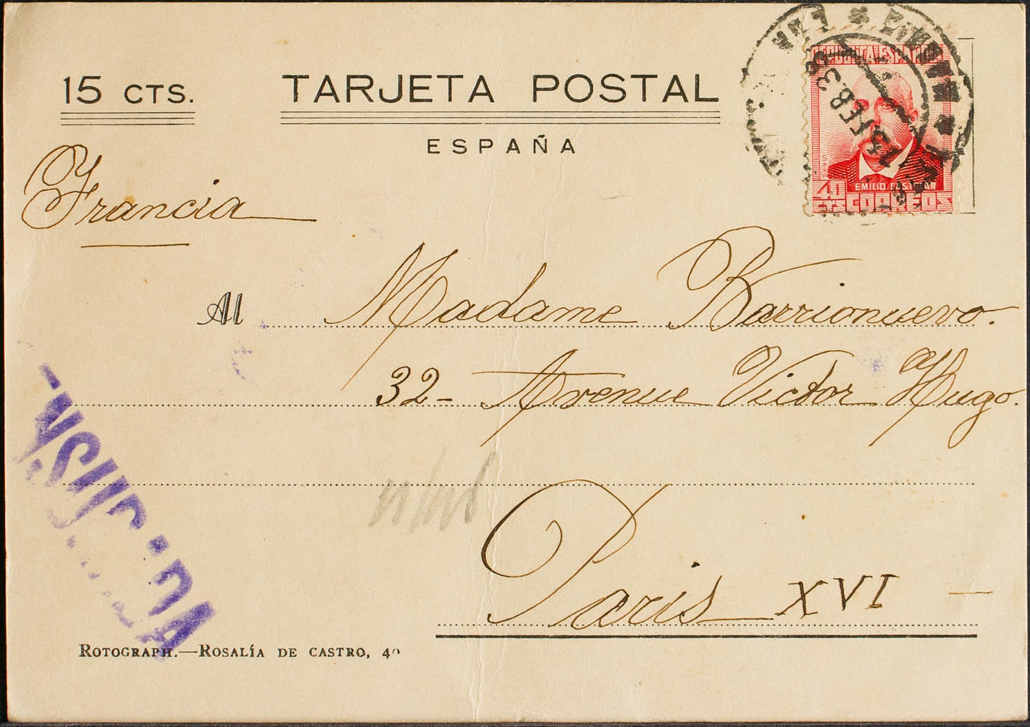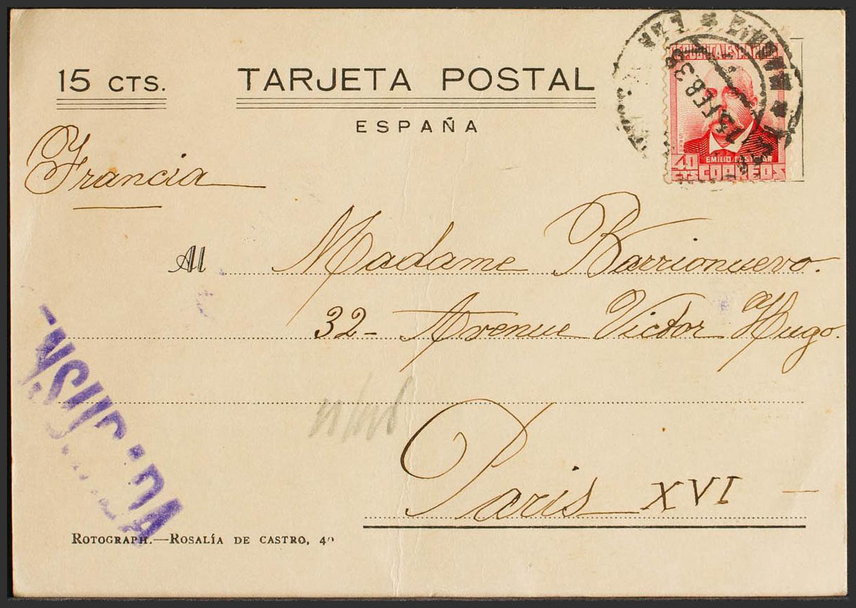 736. 1938. 40 cts carmine. Postal Card with 15 cts surcharge of Private Initiative from MADRID to PARIS (FRANCE). On the back arrival. MAGNIFICENT AND VERY RARE.