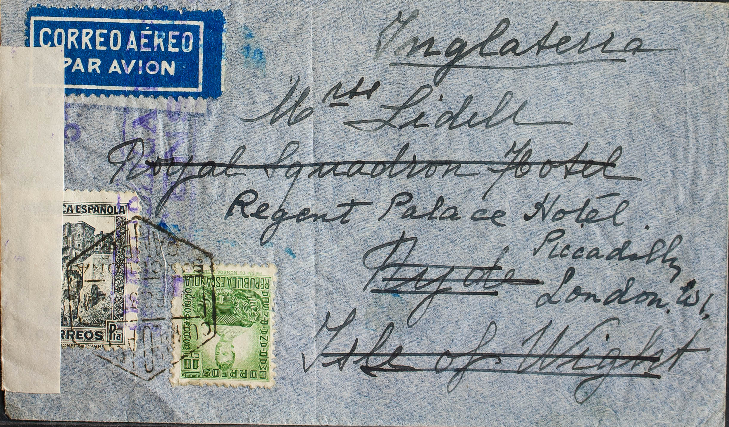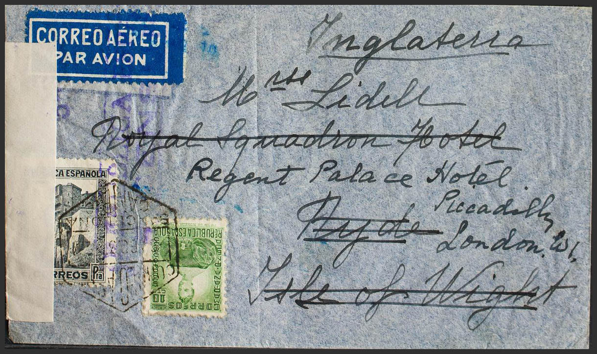 664, 673. 1937. 10 yellow green cts and 1 slate pts. BARCELONA to RYDE (ISLE OF WIGHT), and forwarded to LONDON. On the back transit. MAGNIFICENT AND UNUSUAL REISSUE.