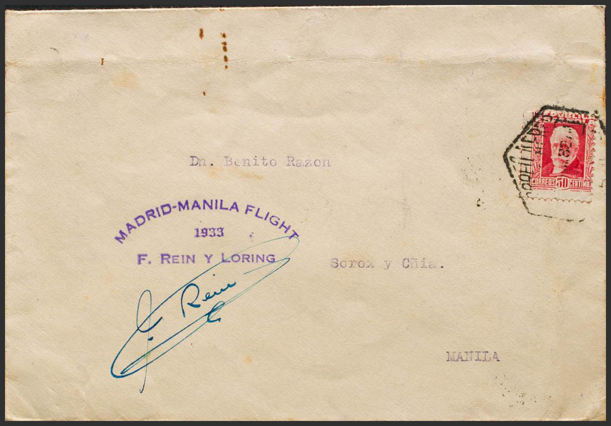 669. 1933. 30 cts carmine. Air Mail from MADRID to MANILA. On the front is the MADRID-MANILA FLIGHT / 1933 / F.REIN Y LORING mark, in violet, and the autograph signature of Fernando Rein y Loring (Pilot of the Madrid-Manila flight), arrival on the back. MAGNIFICENT AND RARE.