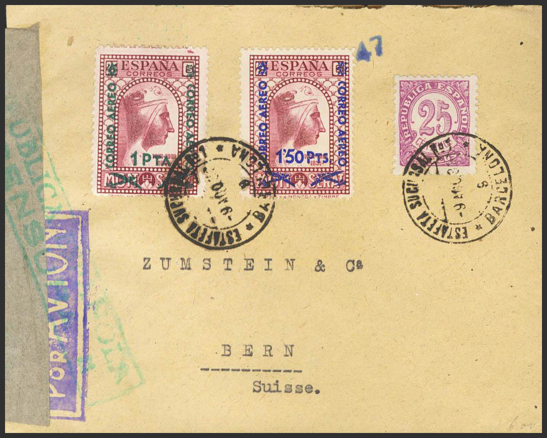 783, 785, 749. 1938. 1 pts on 25 cts, 1.50 pts on 25 cts and 25 cts lilac. BARCELONA to BERNA (SWITZERLAND). MAGNIFICENT.