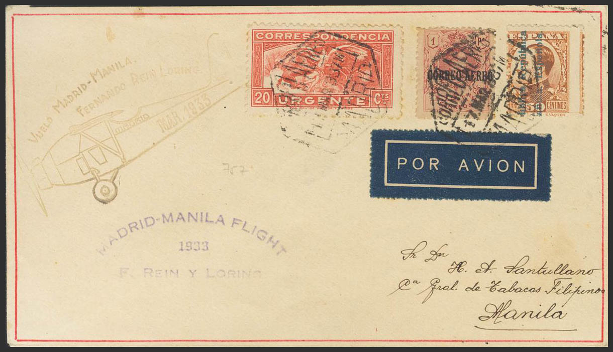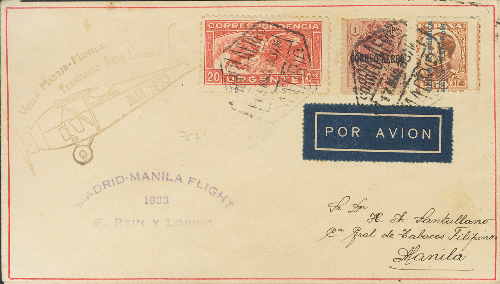 679, 296, 601. 1933. 20 cts red, 1 pts carmine and 50 cts orange. Airmail from MADRID to MANILA (PHILIPPINES). Marks MADRID-MANILA FLIGHT / FERNANDO REIN LORING, in sepia and MADRID-MANILA FLIGHT / 1933 / F. REIN Y LORING, in violet. MAGNIFICENT AND VERY RARE.