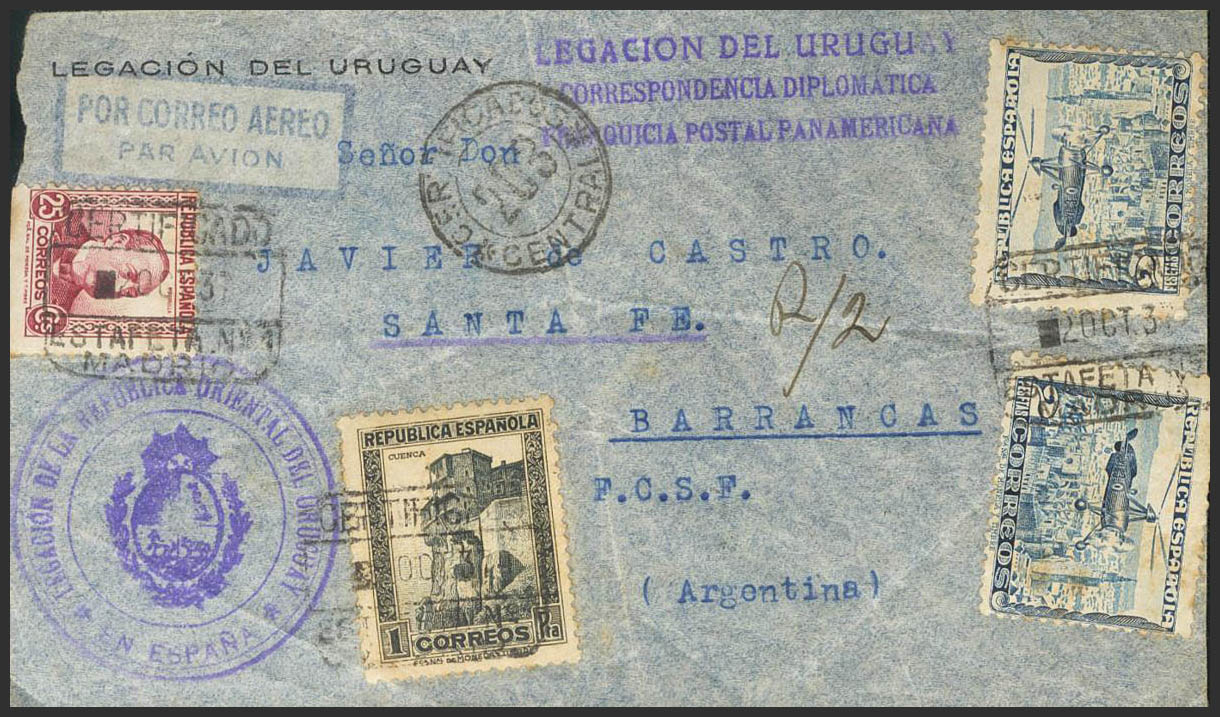 689(2), 673, 685. 1937. 2 pts blue, two seals, 1 pts slate and 25 cts carmine. Certificate from MADRID to BARRANCAS (ARGENTINA). On the front it marks LEGATION OF THE EASTERN REPUBLIC OF URUGUAY, in purple and on the back it marks arrival. MAGNIFICENT.
