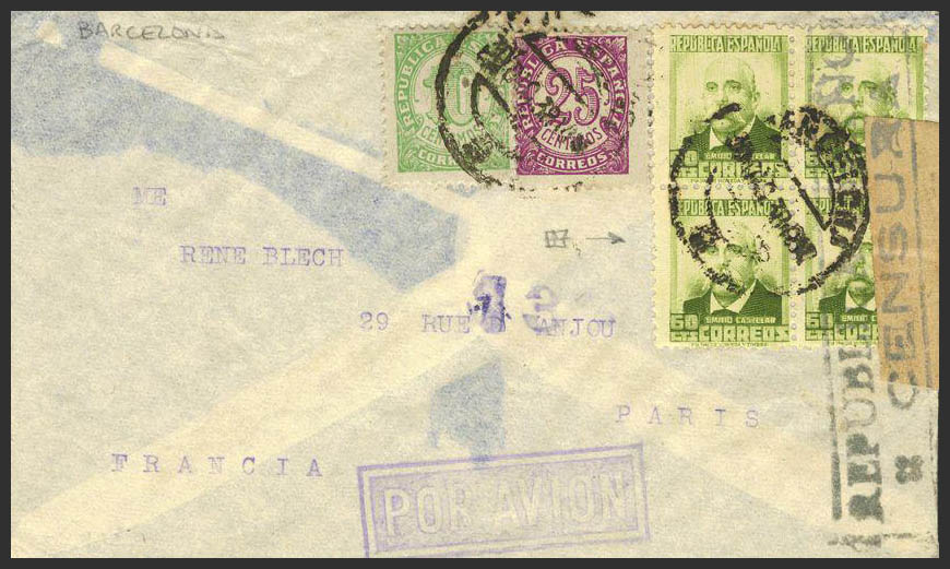672(4),746,748. 1938. 5 cts, 25 cts and 60 cts, block of four. BARCELONA to PARIS. Postmark BARCELONA / (2), transported "BY AIR MAIL". MAGNIFICENT.