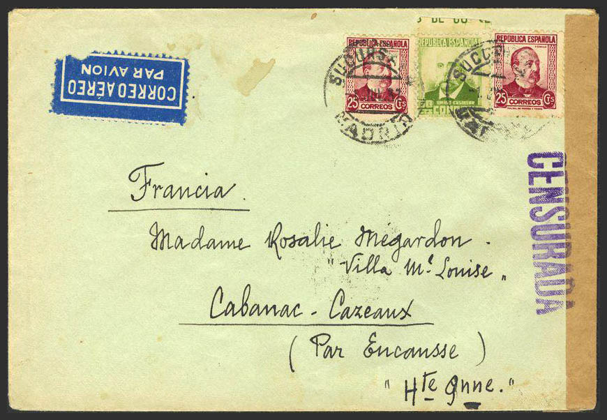 672,685(2). 1937. 60 cts and 25 cts, two stamps. MADRID to CABANAL (FRANCE). SUCURSAL / MADRID postmark, transported "BY AIR MAIL", arrival on the back. MAGNIFICENT.