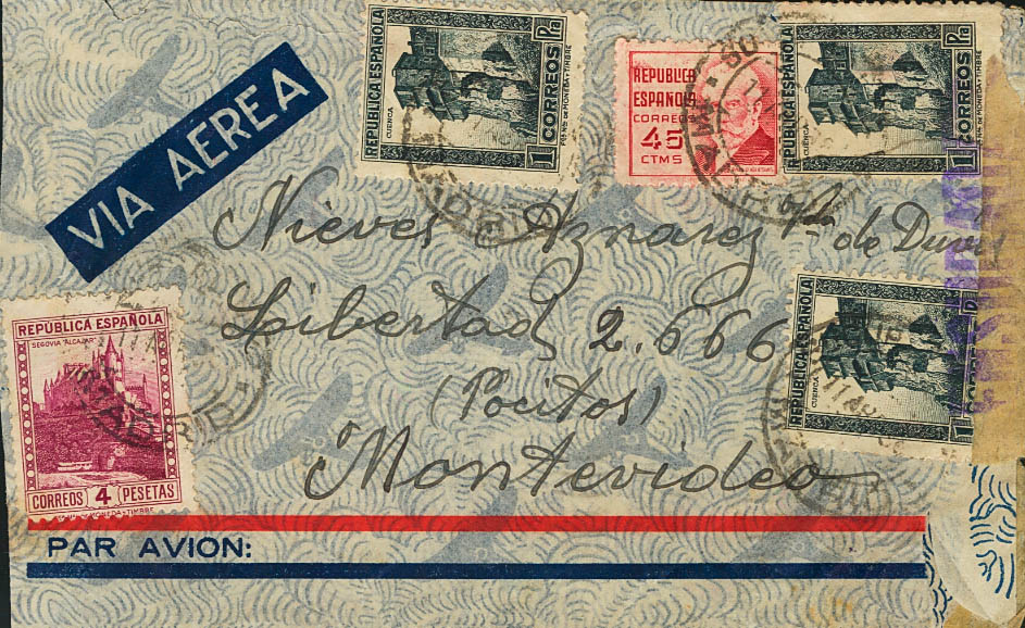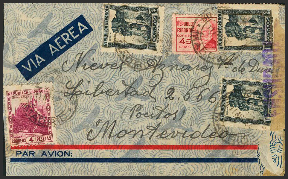 673(3), 674, 737. 1938. 1 slate pts, three stamps (one with minor defect, mentioned only for information), 4 lilac pts and 45 carmine cts. MADRID to MONTEVIDEO. On the back arrival. MAGNIFICENT.