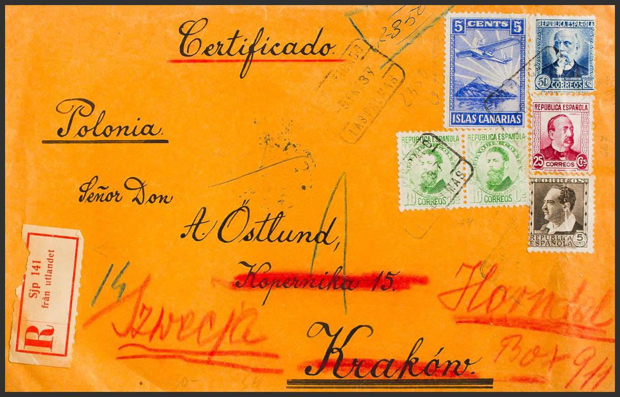 664(2), 681, 685, 688. 1937. 10 cts green, pair, various values and Charity of 5 cts CANARY ISLANDS. Certificate from LAS PALMAS to KRAKOW (POLAND), and forwarded to SWEDEN (invisible file fold). On the back transits and arrival. MAGNIFICENT AND RARE REISSUE.