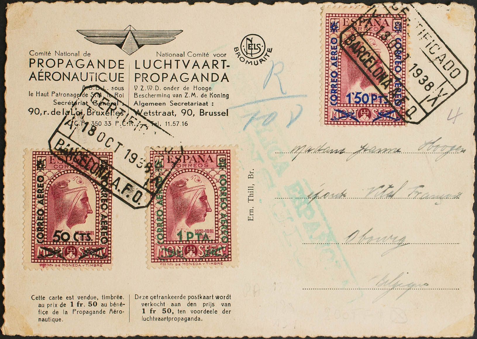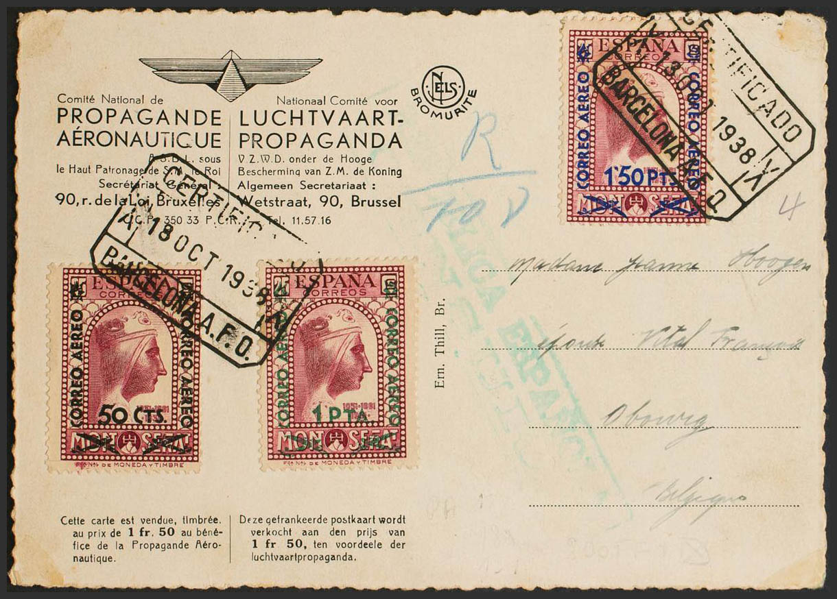 English 782, 783, 785. 1938. 50 sts over 25 cts, 1 sts over 25 cts and 1´50 sts over 25 cts. Certified Post Card from BARCELONA to BELGIUM. MAGNIFICENT AND RARE.