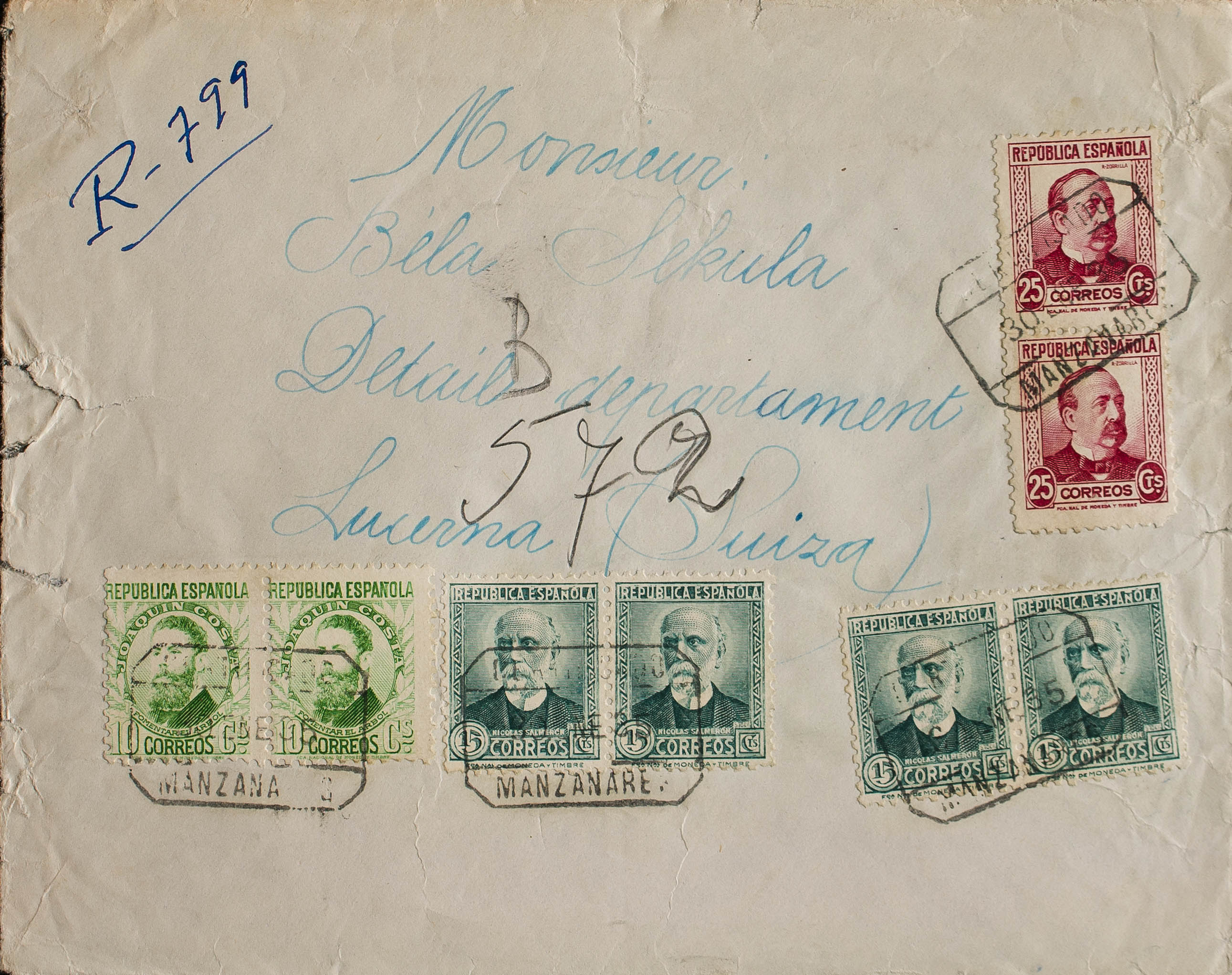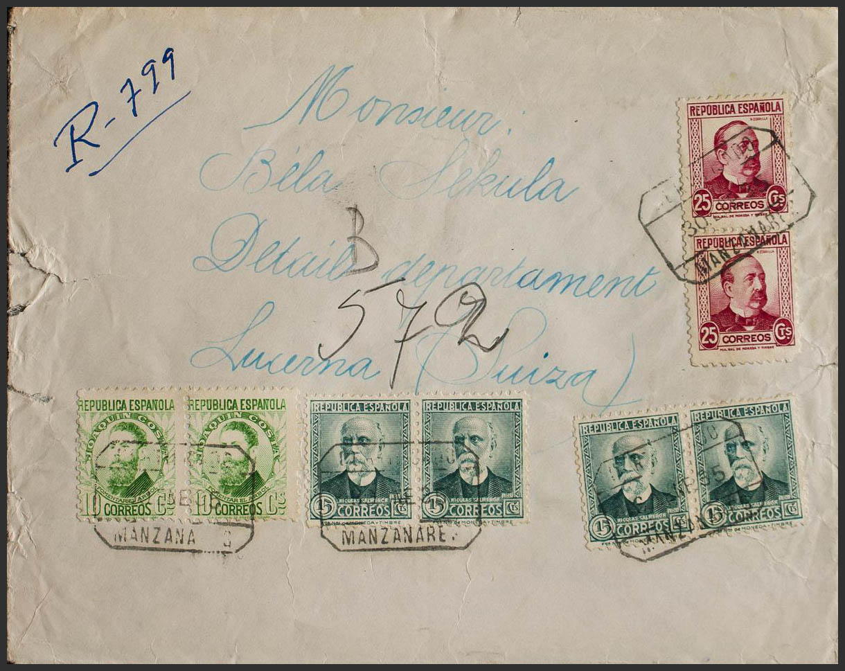 664(2), 665(4), 685(2). 1935. 10 cts green yellow, pair, 15 cts green, four stamps and 25 cts carmine, two stamps. Certificate from MANZANARES to LUCERNA (SWITZERLAND). On the back arrival. MAGNIFICENT.