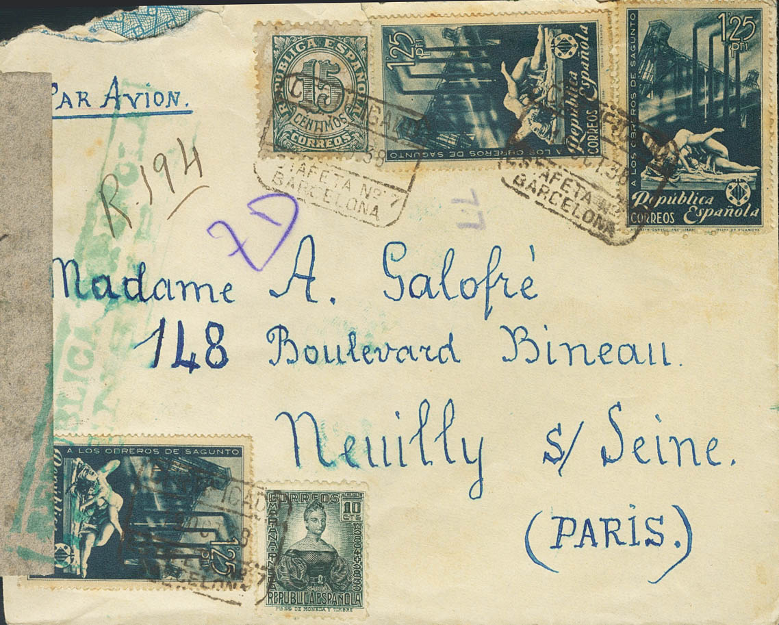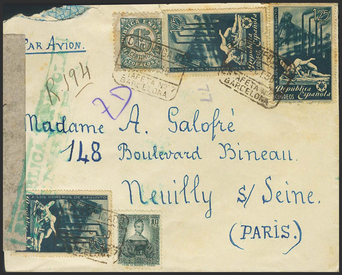 774(3), 732, 747. 1938. 1´25 blue pts, three seals, 10 blue green cts and 15 gray green cts. Certificate from BARCELONA to NEUILLY SUR SEINE (FRANCE). On the back arrival. MAGNIFICENT.