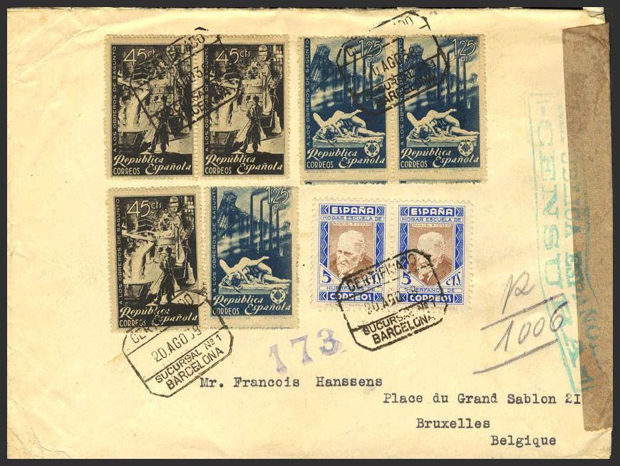 773(3), 774(3). 1938. 45 cts. three stamps and 1.25 cts. blue, three seals. BARCELONA to BRUSSELS. MAGNIFICENT.