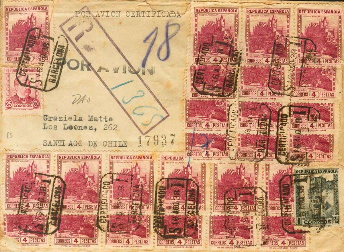 |ENVELOPE| 673, 674(25), 685. 1938. 1 pts slate, 4 pts lilac carmine, twenty-five stamps (one with an unimportant defect) and 25 cts carmine. Certificate from BAGoodELONA to SANTIAGO DE CHILE. Arrival on the back. MAGNIFICENT AND SPECTACULAR AND VERY RARE POSTAGE OF 101.25 PTS, ONE OF THE LARGEST KNOWN IN THIS ISSUE.