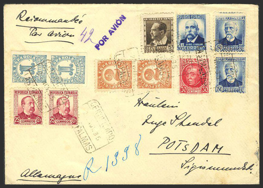 677/78(2), 685(2), 688(2). 1935. Various values. Certified Air Letter from LAS PALMAS to POSTDAM (GERMANY). On the back arrival. MAGNIFICENT.