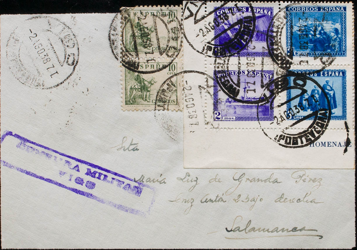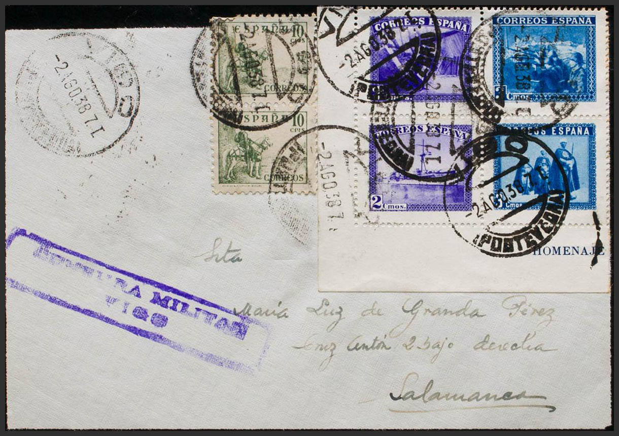 849A, 849B, 849C, 849D. 1938. 2 cts lilac, two stamps, 3 cts blue, two stamps and 10 cts green, two stamps. VIGO to SALAMANCA. On the back arrival. MAGNIFICENT AND RARE.