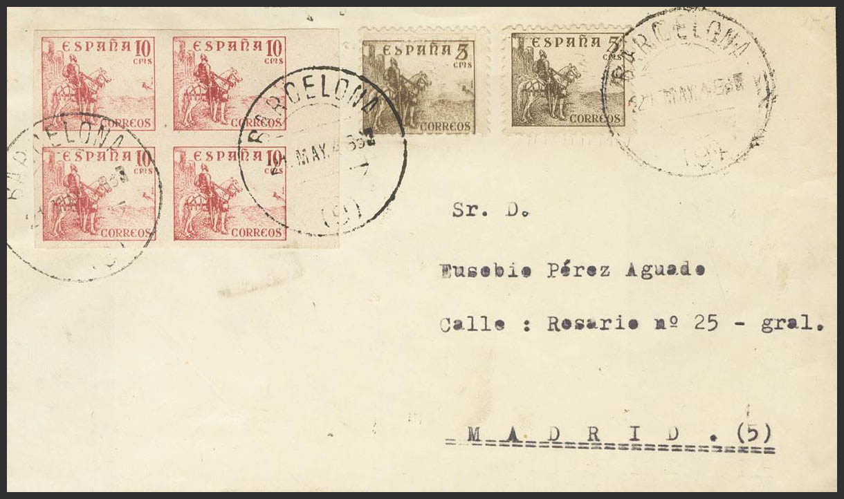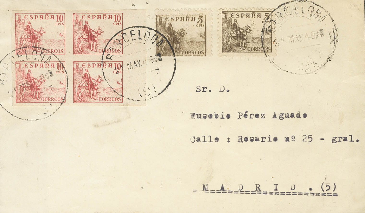 916(2), 917s(4). 1948. 5 cts sepia, two stamps and 10 cts UNTOOTHED pink, block of four. BARCELONA to MADRID. On the back arrival. MAGNIFICENT.