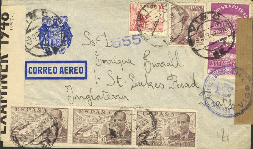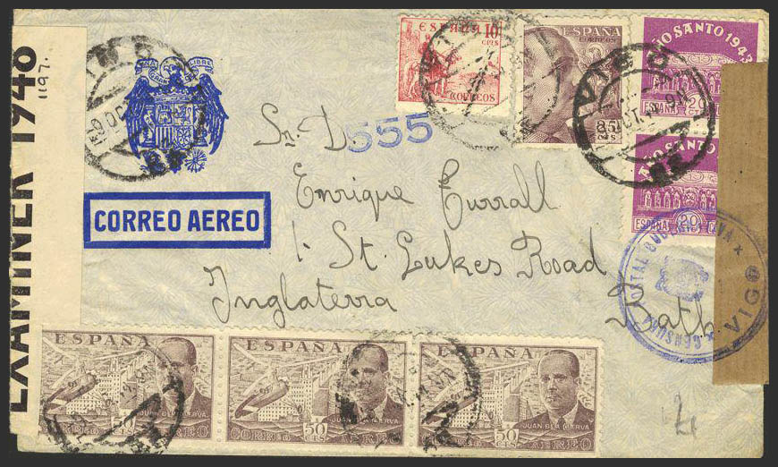 961(2), 917, 923, 943(3). 1944. 10 cts., 25 cts., 20 cts., two stamps and 50 cts, three stamps. VIGO to BATH (ENGLAND). Postmark VIGO / 23, transported in "AIR CORREO", on the front mark CENSURA POSTAL GOVERNMENT / VIGO. MAGNIFICENT.