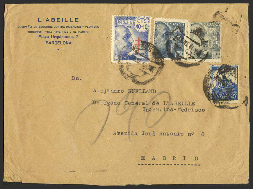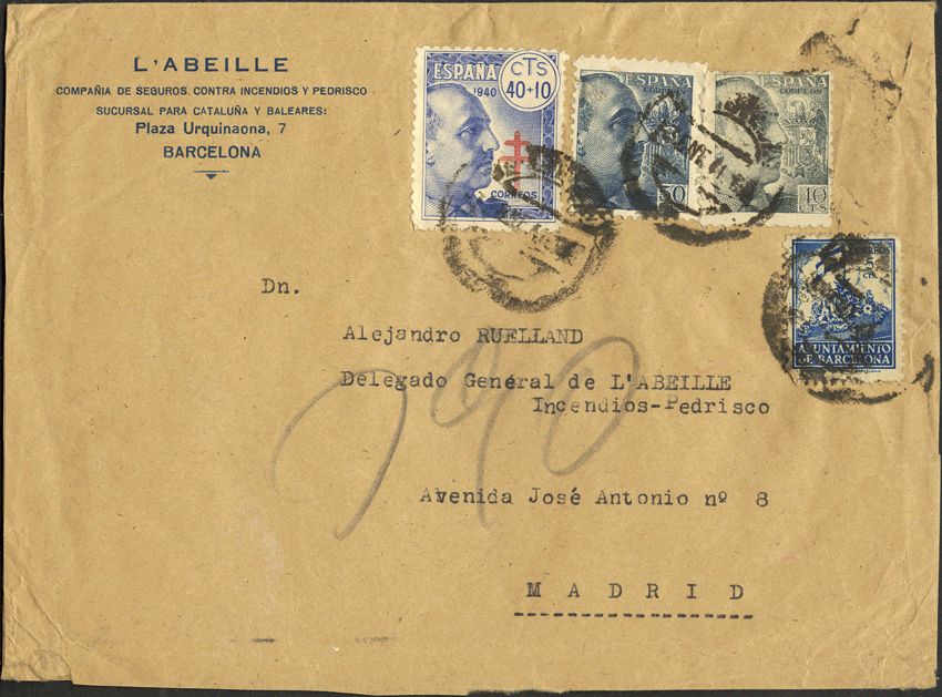 925, 872, 938, AYT.24. 1941. 40 cts., 50 cts., 40+10 cts. and 5 cts. Barcelona's town hall. BARCELONA to MADRID. Postmark BARCELONA / 2, arrival back. WEIRD.