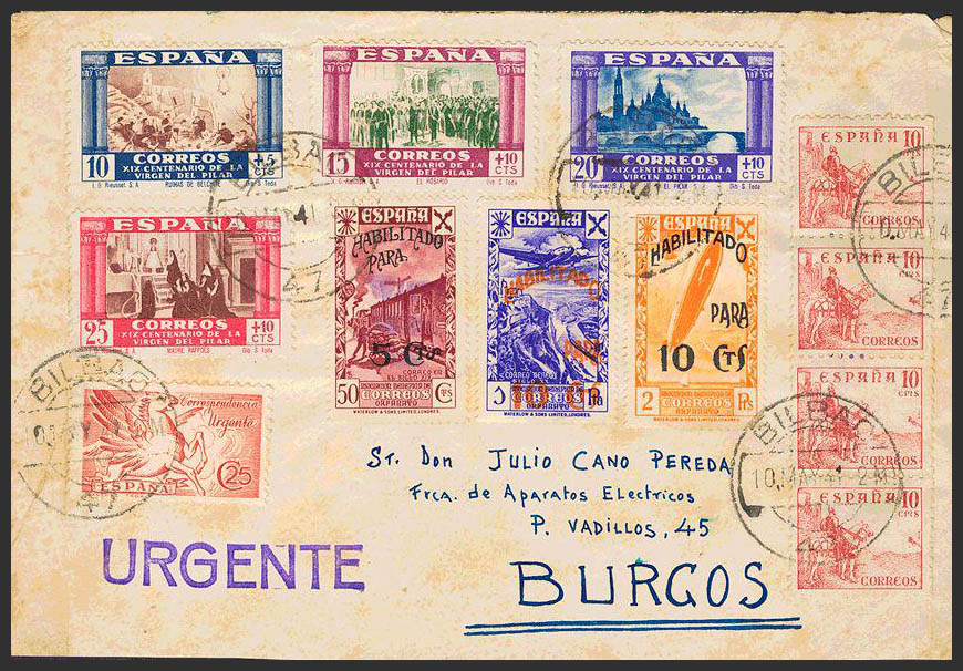 English 818(4), 889/92, 879. 1941. Various values. BILBAO to BURGOS. On the back arrival and manuscript "CARRIED AS URGENTLY CLOSED. THE POSTMAN", in the absence of a flap. MAGNIFICENT.