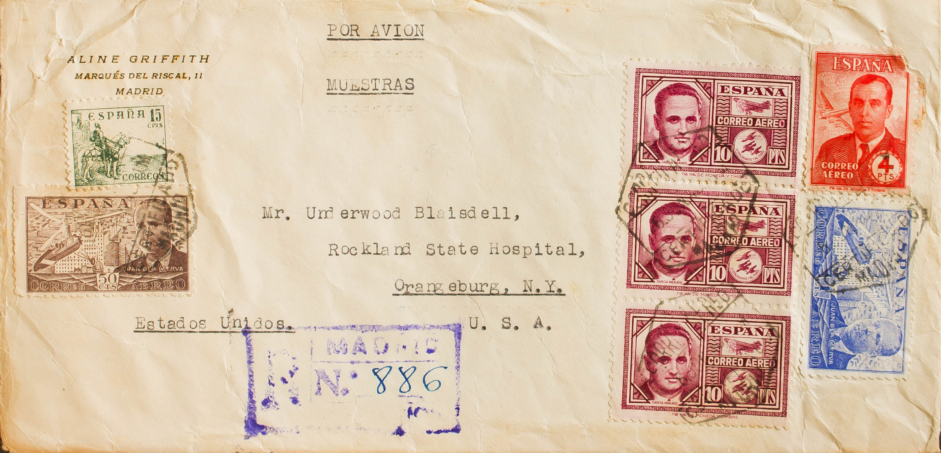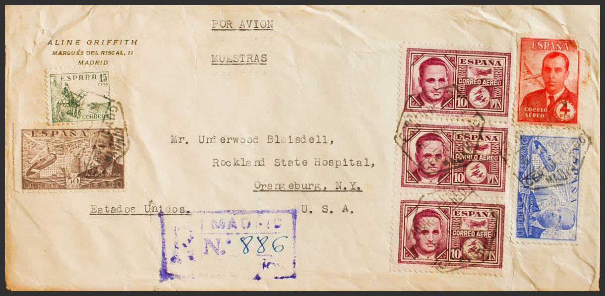 991, 992(3), 918, 943, 944. 1946. 10 carmine sts, three stamps and 4 red sts (small unimportant defect). Certificate from MADRID to ORANGEBURG (USA). On the back arrival. MAGNIFICENT AND RARE POSTAGE.